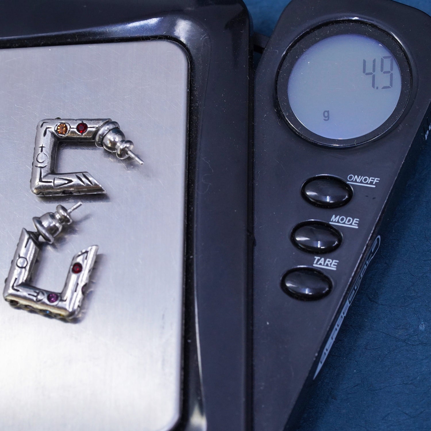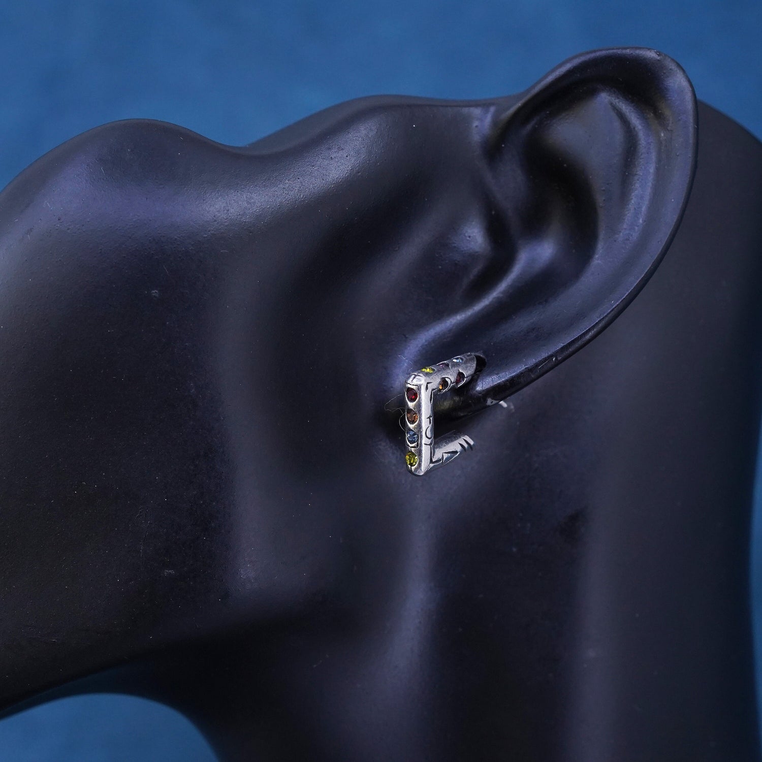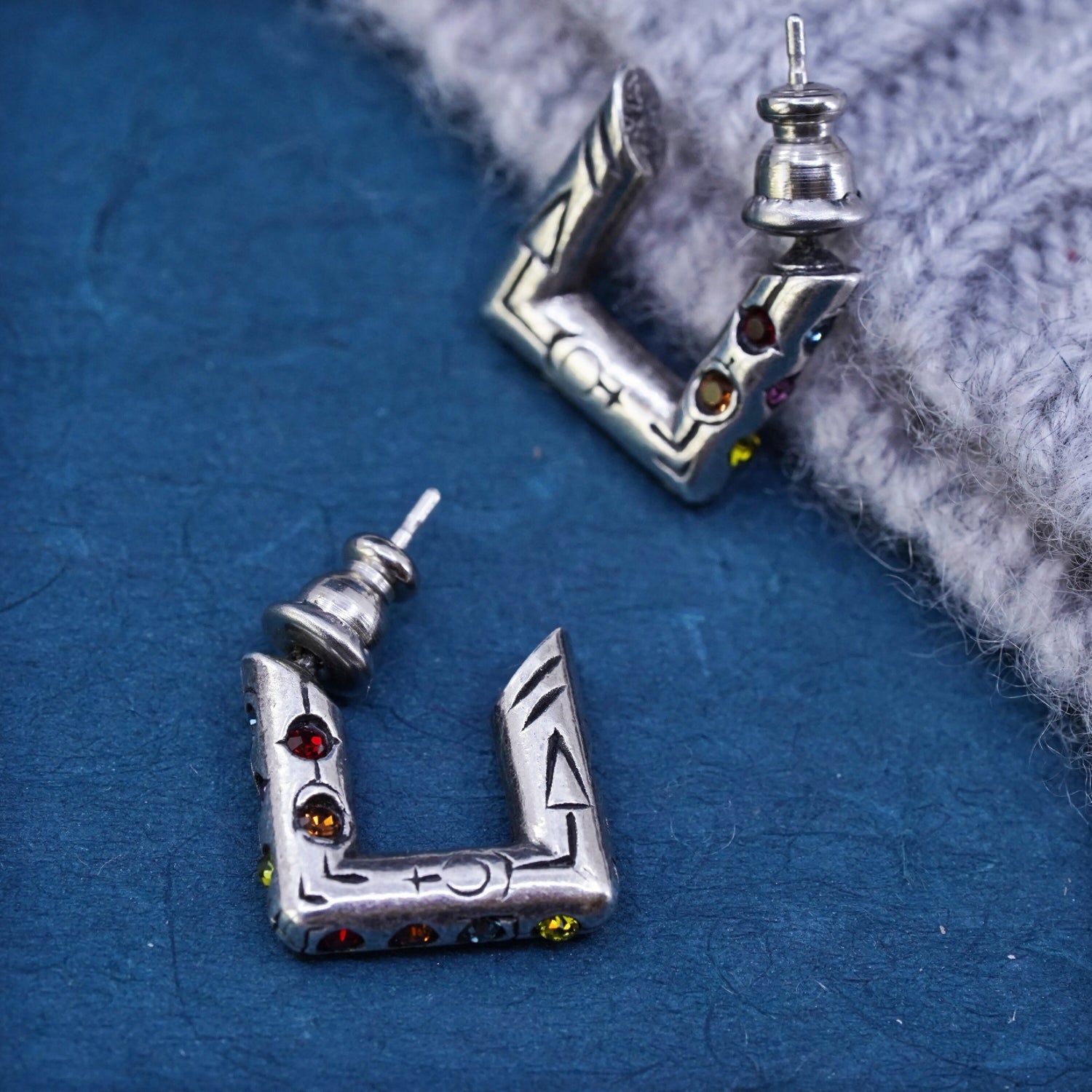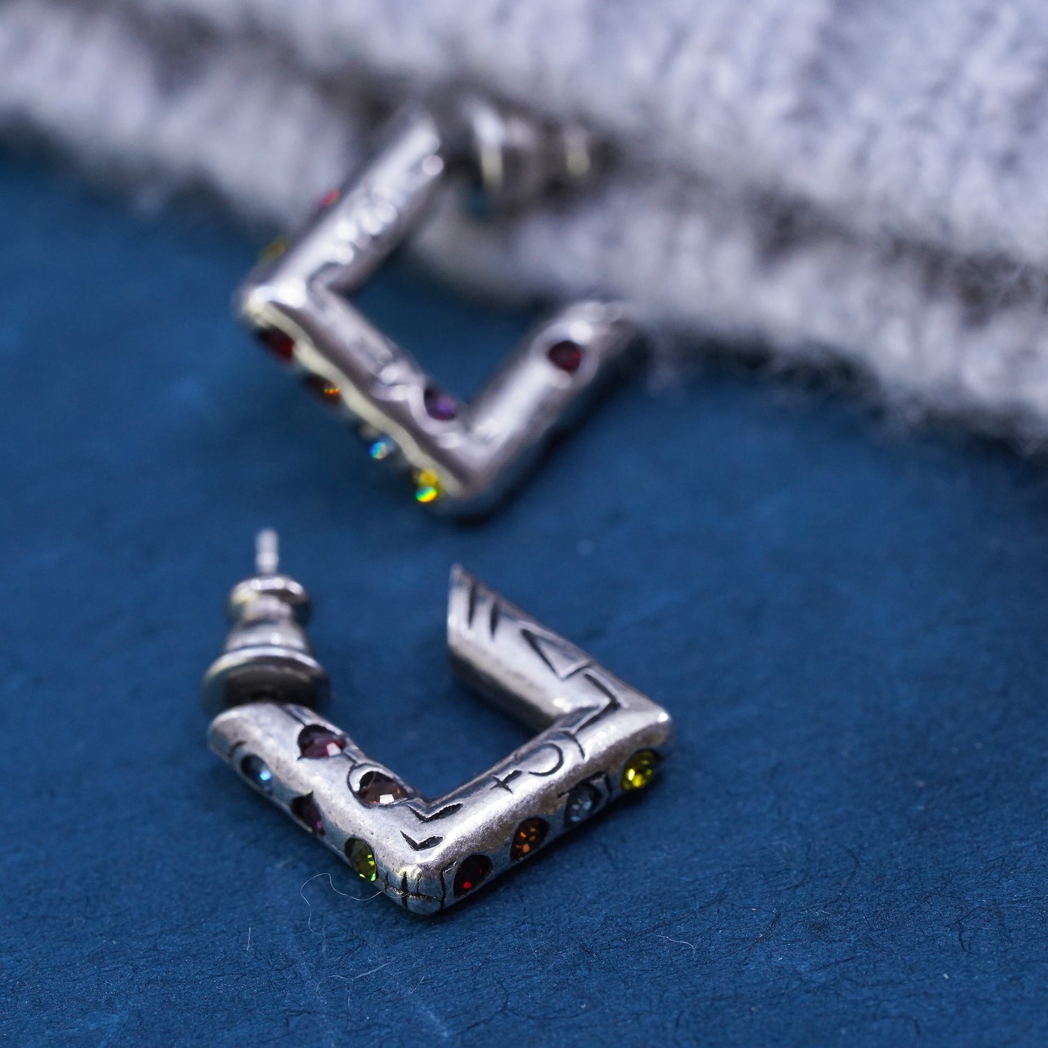 0.5", vintage Sterling silver handmade square hoop earrings, 925 huggie with crystal. silver tested