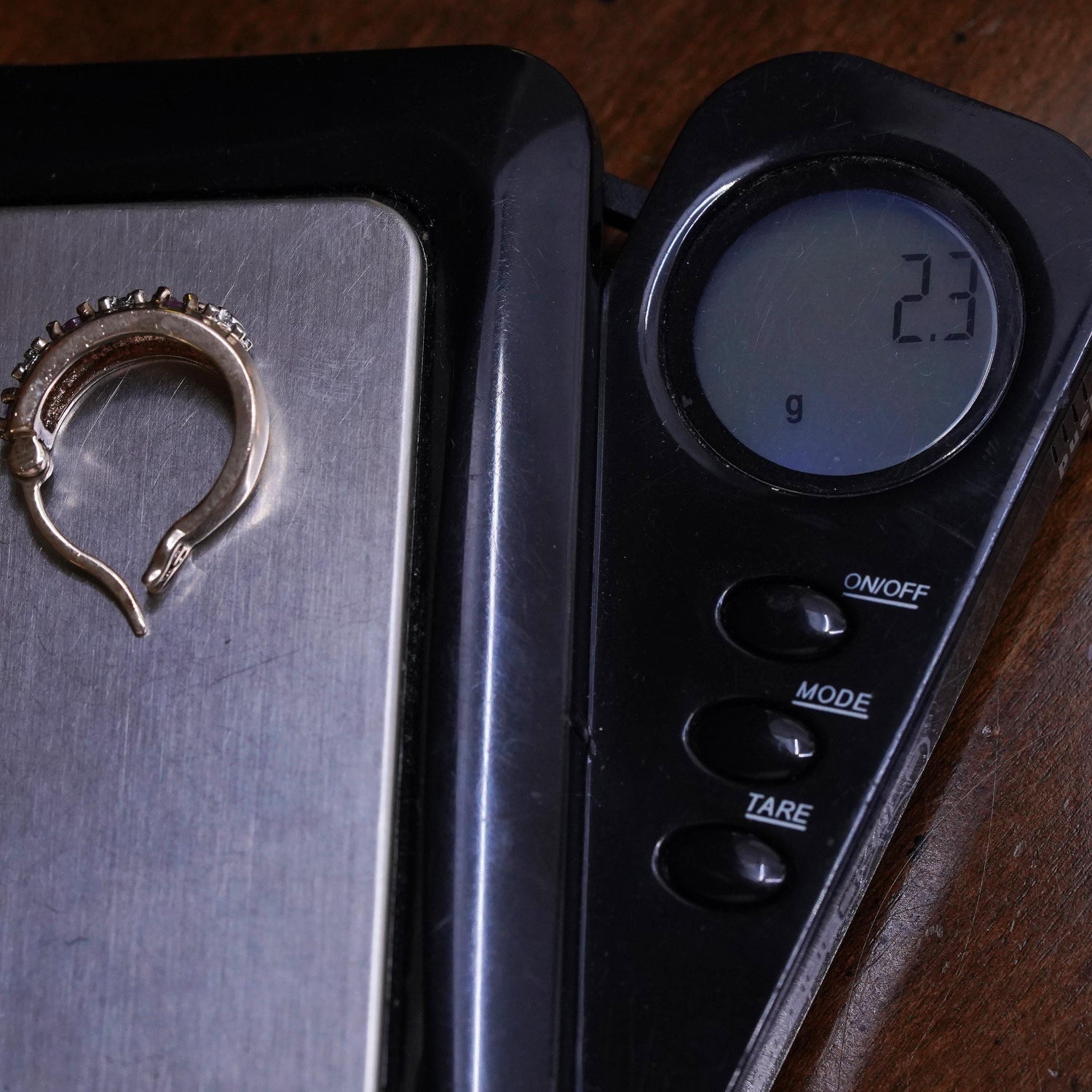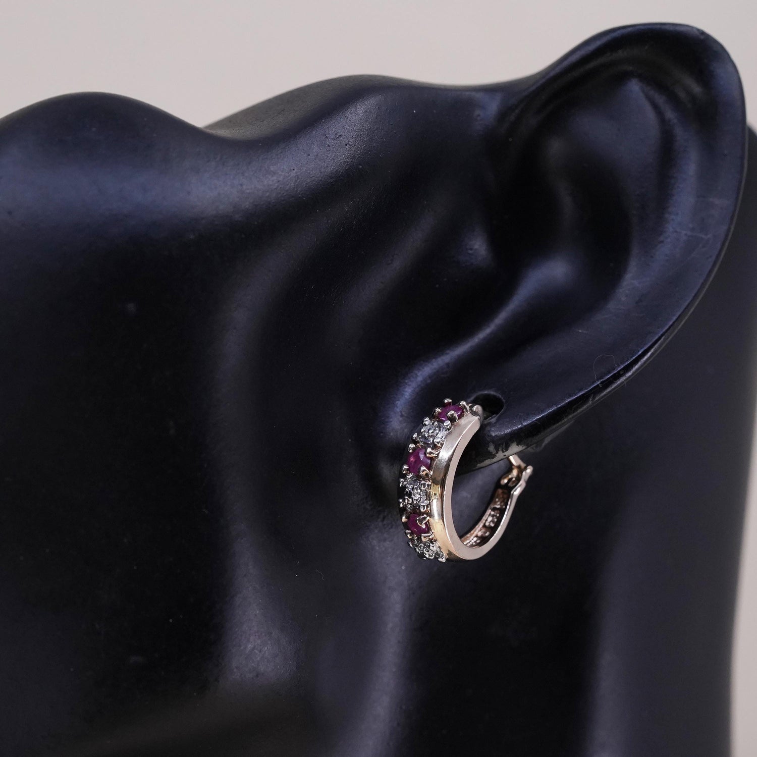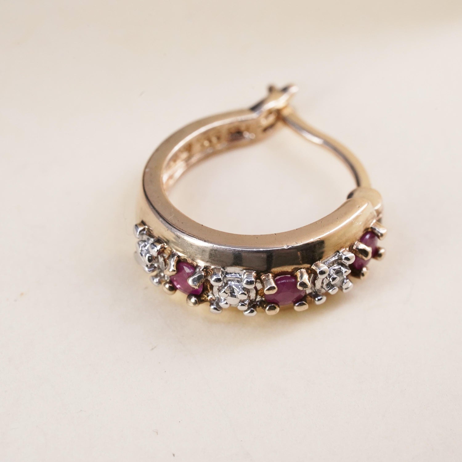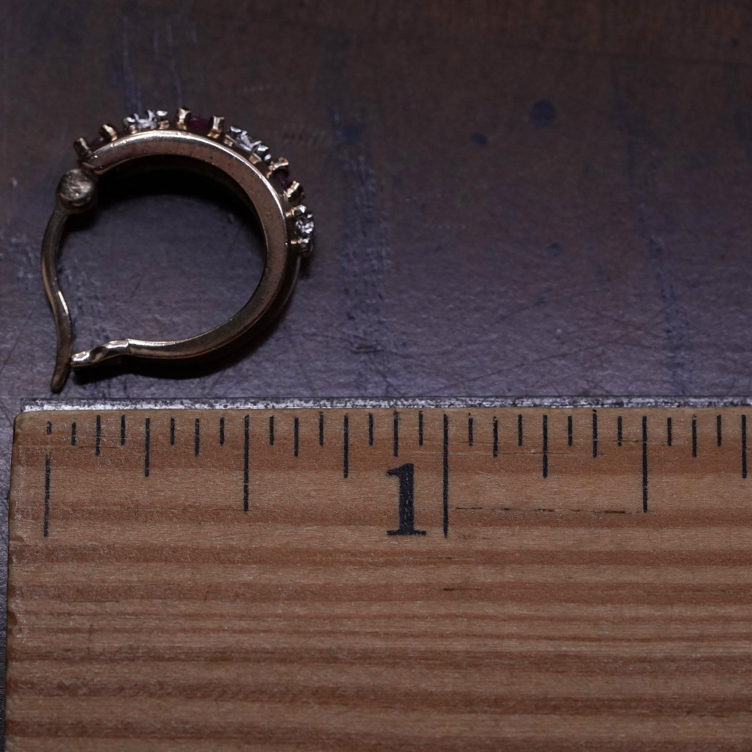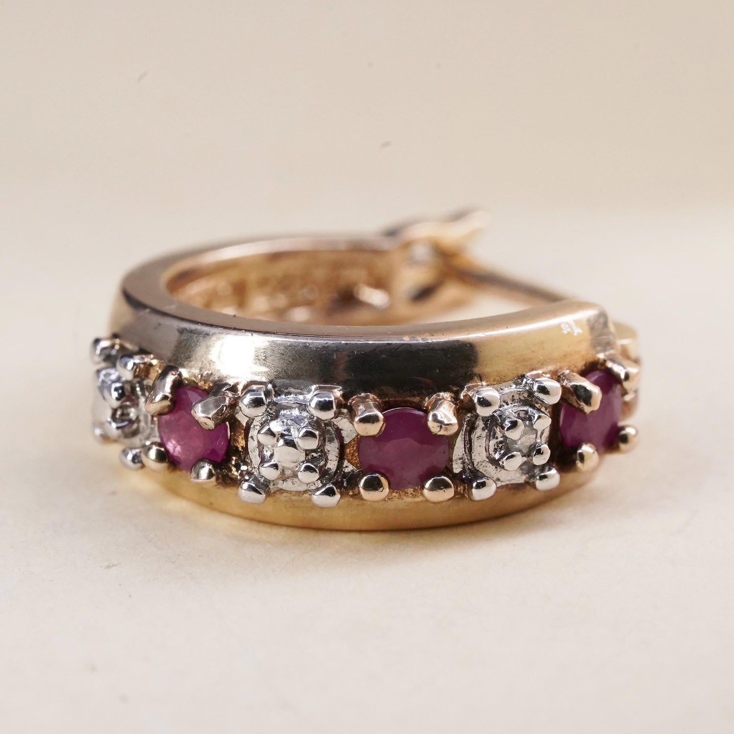 0.5", Vintage vermeil gold over sterling silver single earring, 925 huggie hoop with ruby and diamond, stamped 925