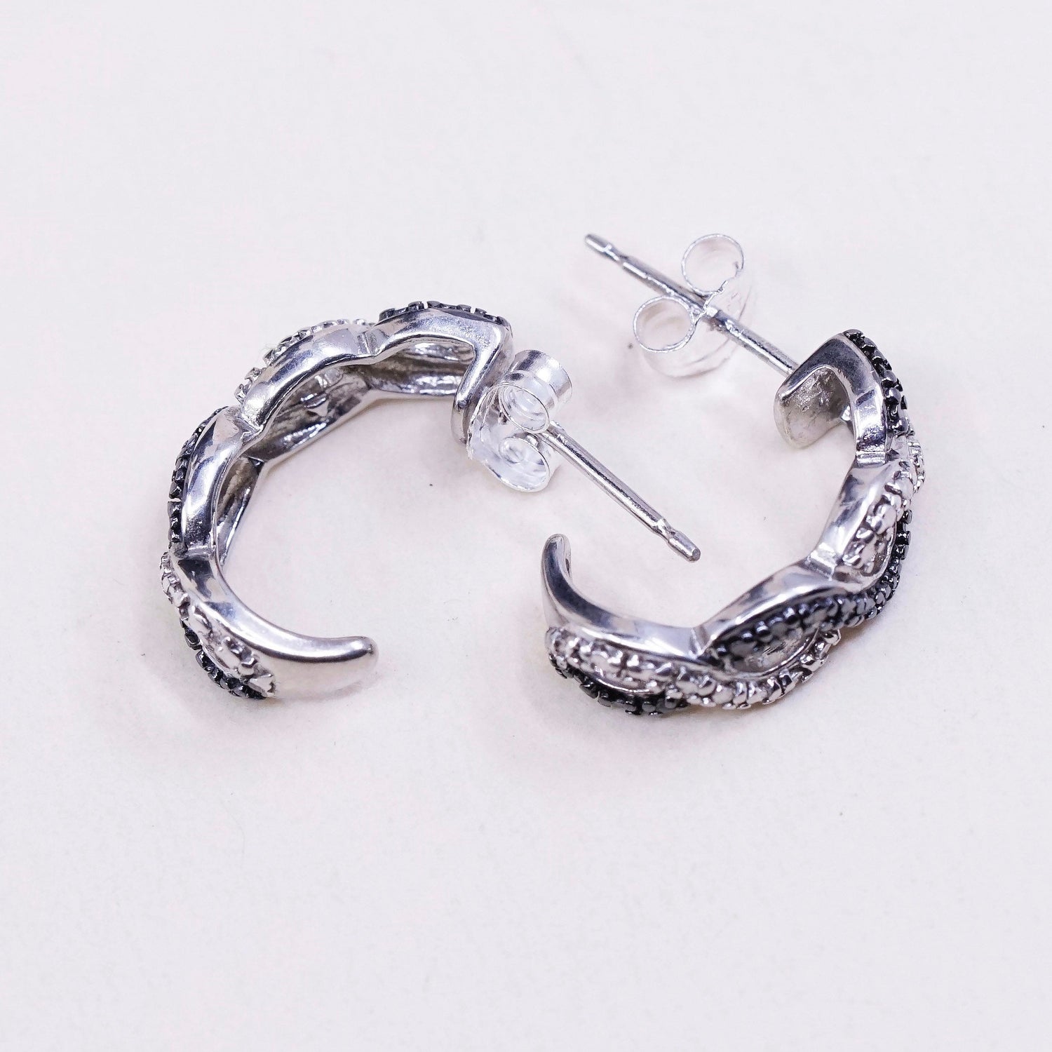 0.5", Vintage sterling silver earrings, 925 silver huggie with genuine diamond, stamped 925