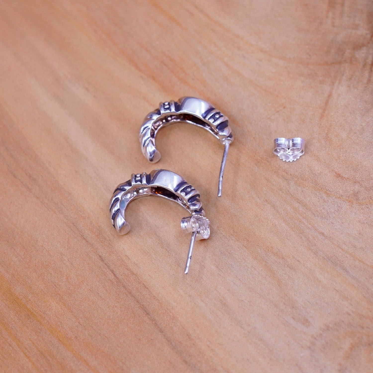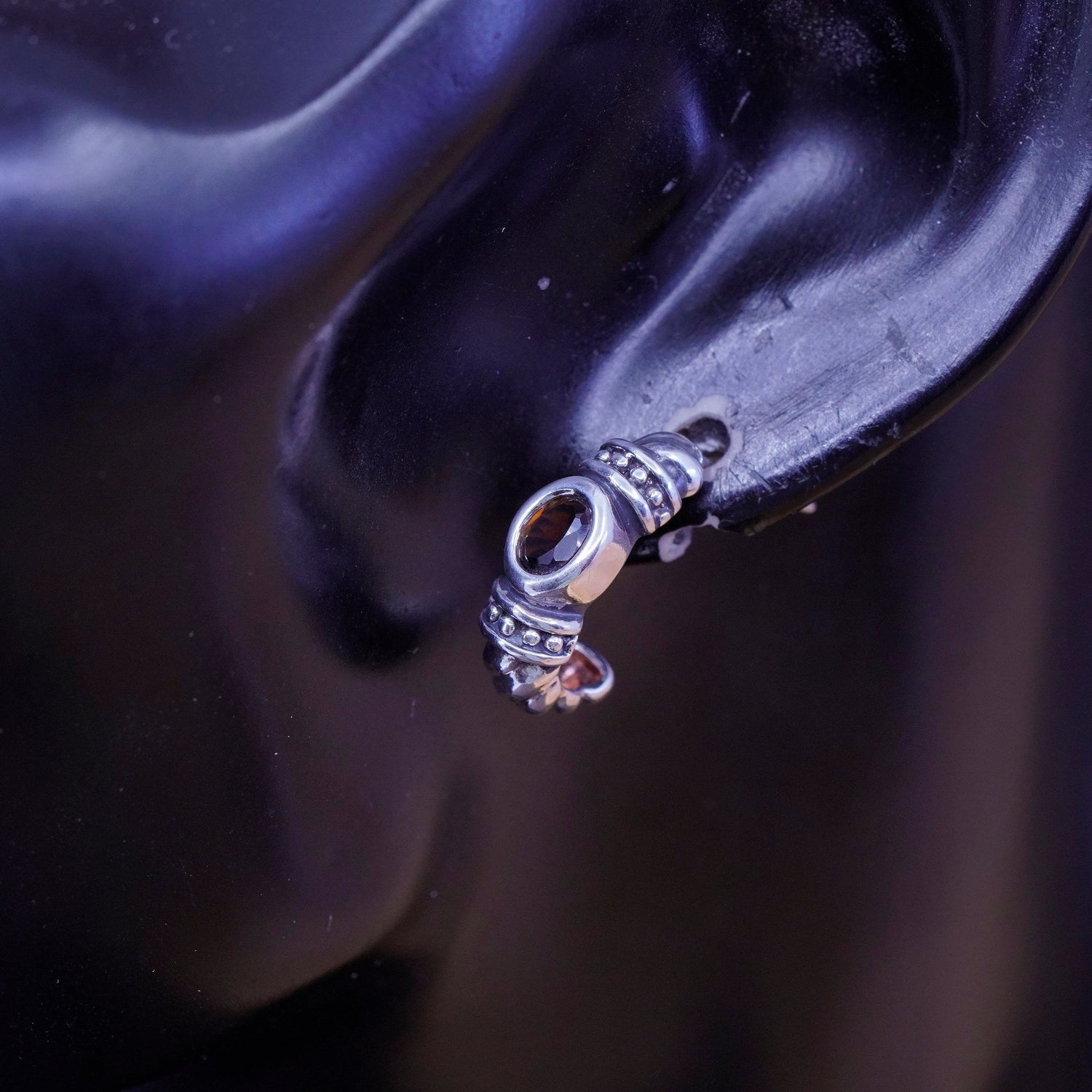 0.5", vintage Sterling silver handmade earrings, 925 huggie hoops with ruby inlay, stamped 925
