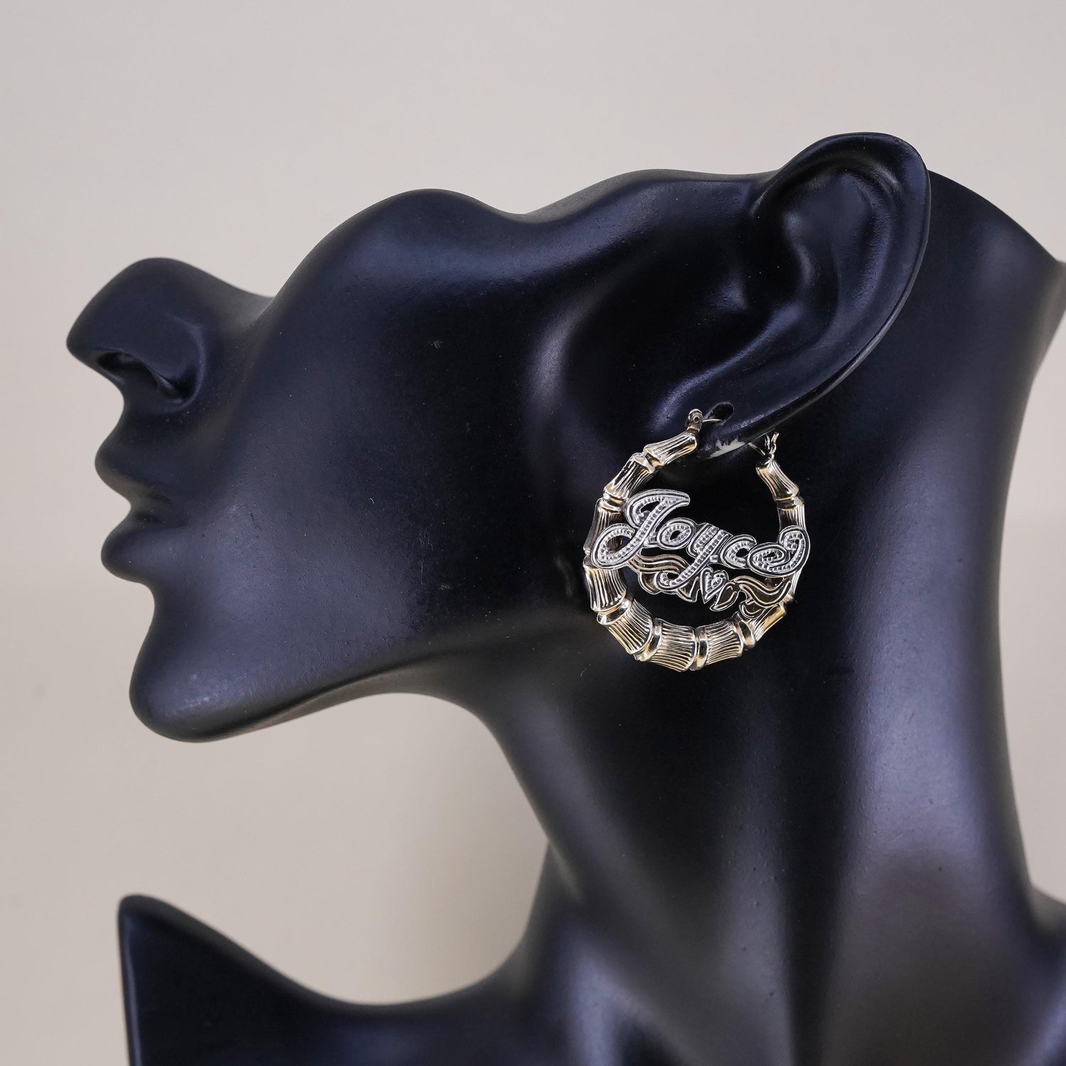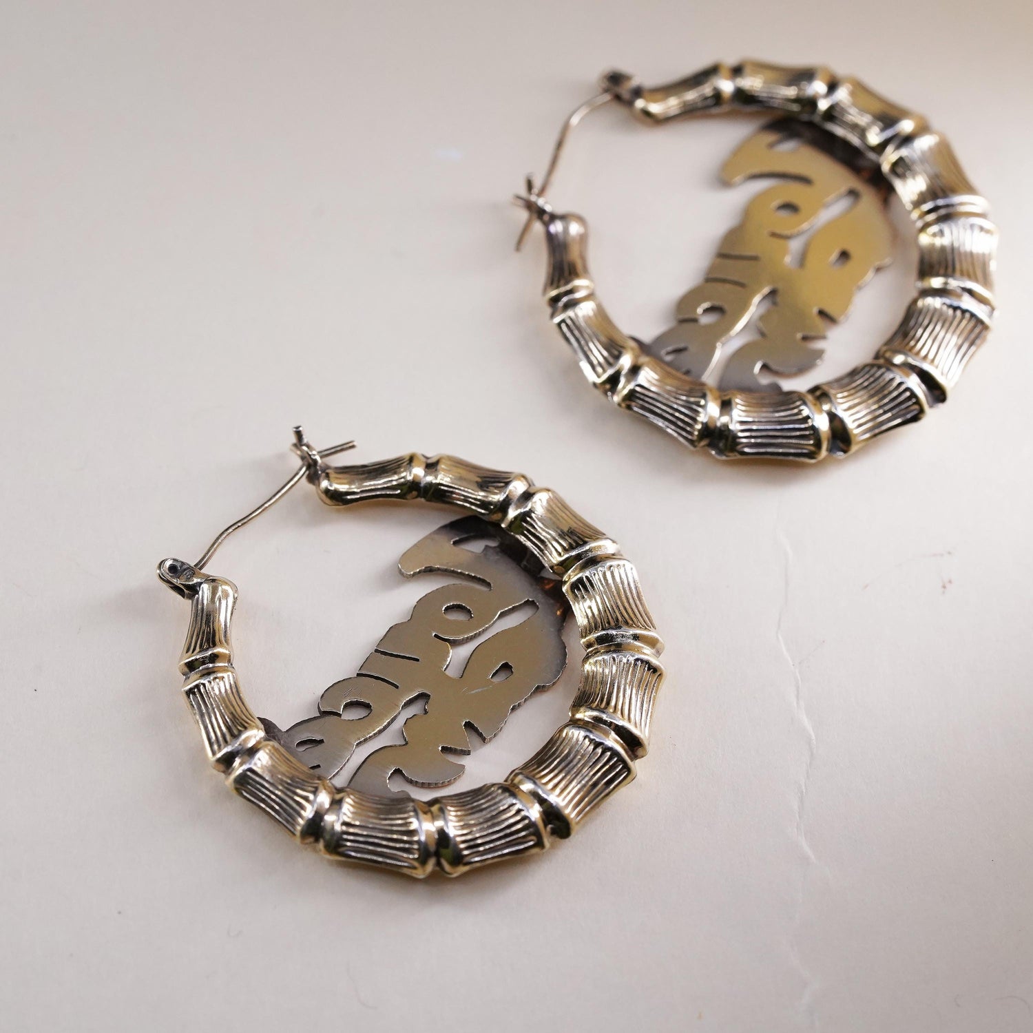 1.5", Vintage vermeil gold over sterling silver loop earrings, textured bamboo minimalist hoops with Joyce, stamped 925 JAD