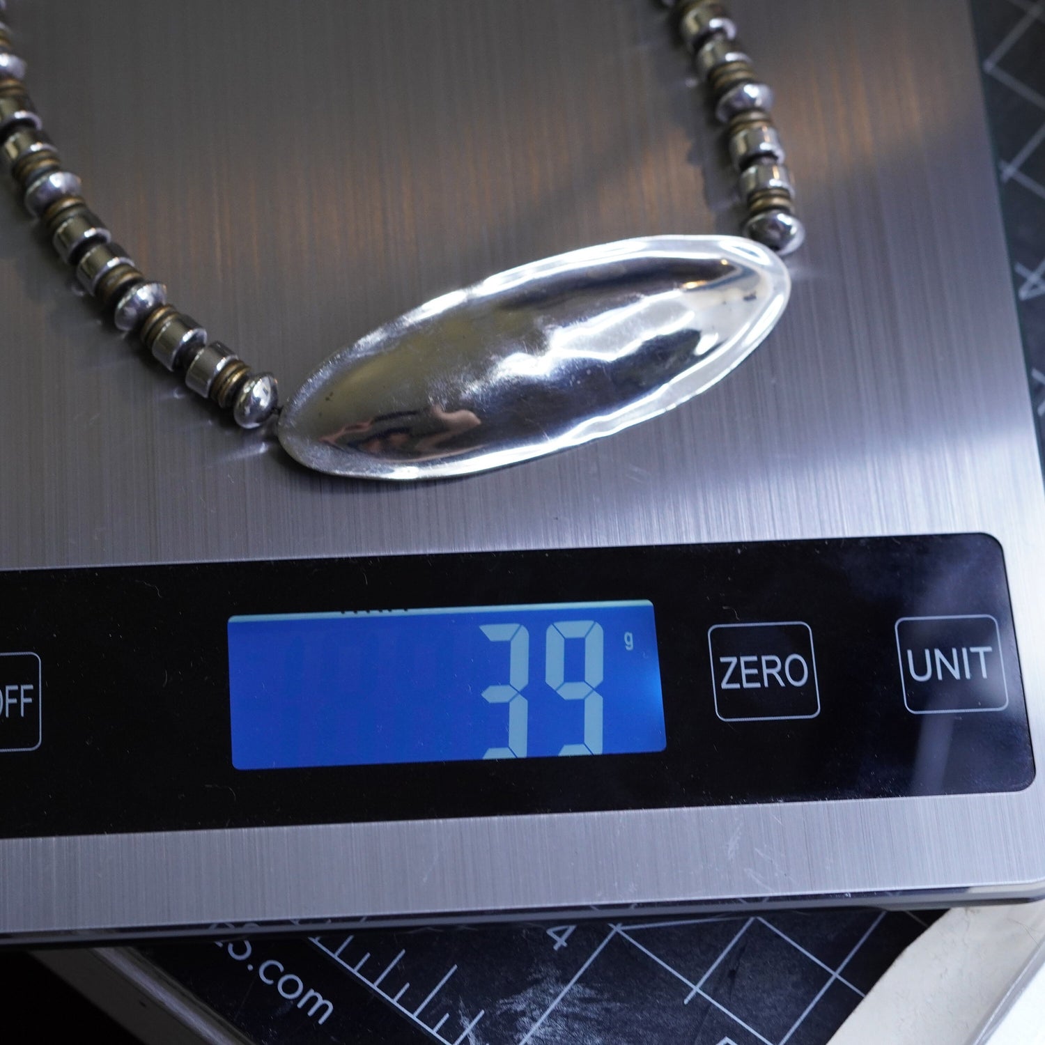 14” Sterling silver necklace, 925 cube chain with brass discs long oval pendant