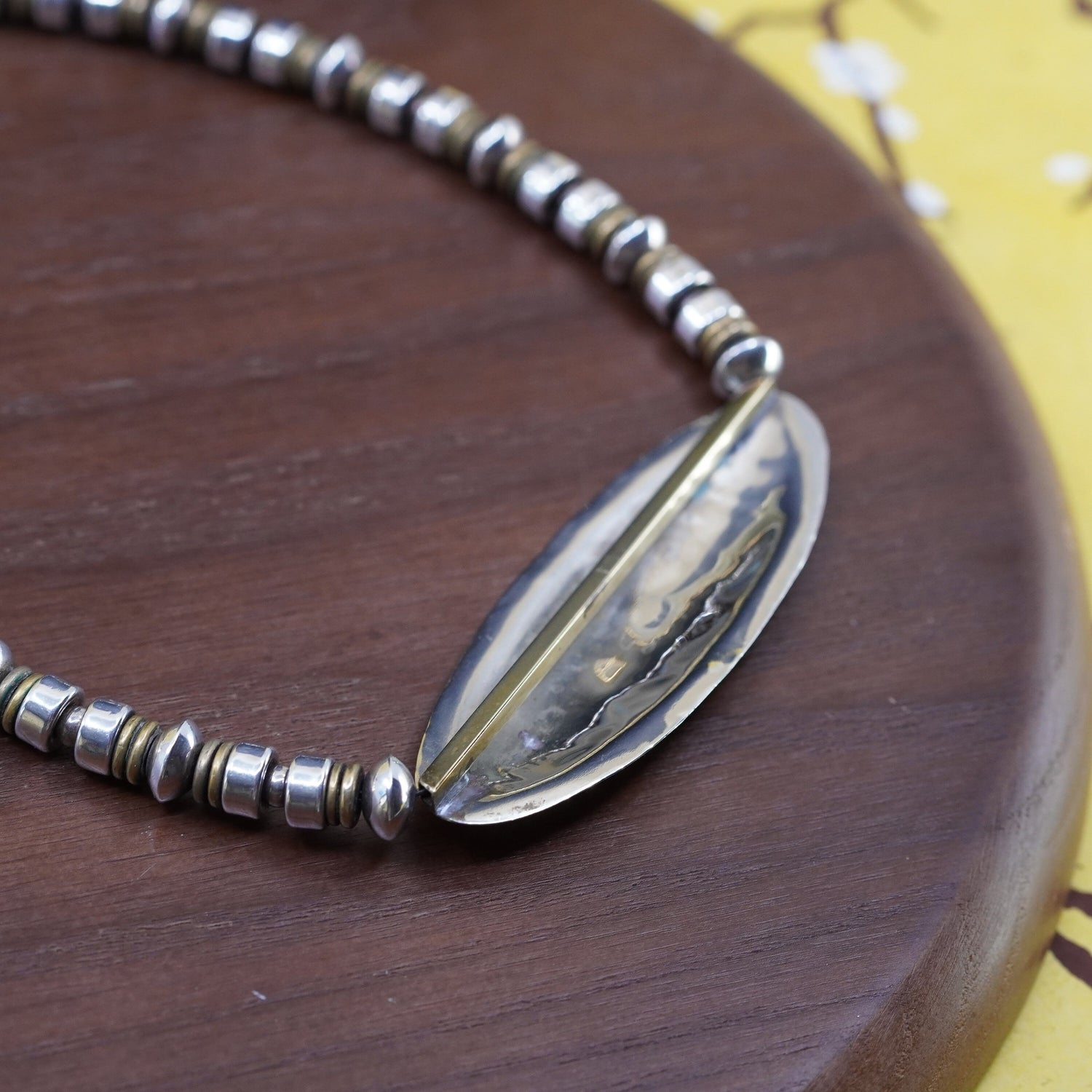 14" 7mm, vintage Sterling silver necklace, 925 cube chain with brass discs and long oval pendant, stamped 925