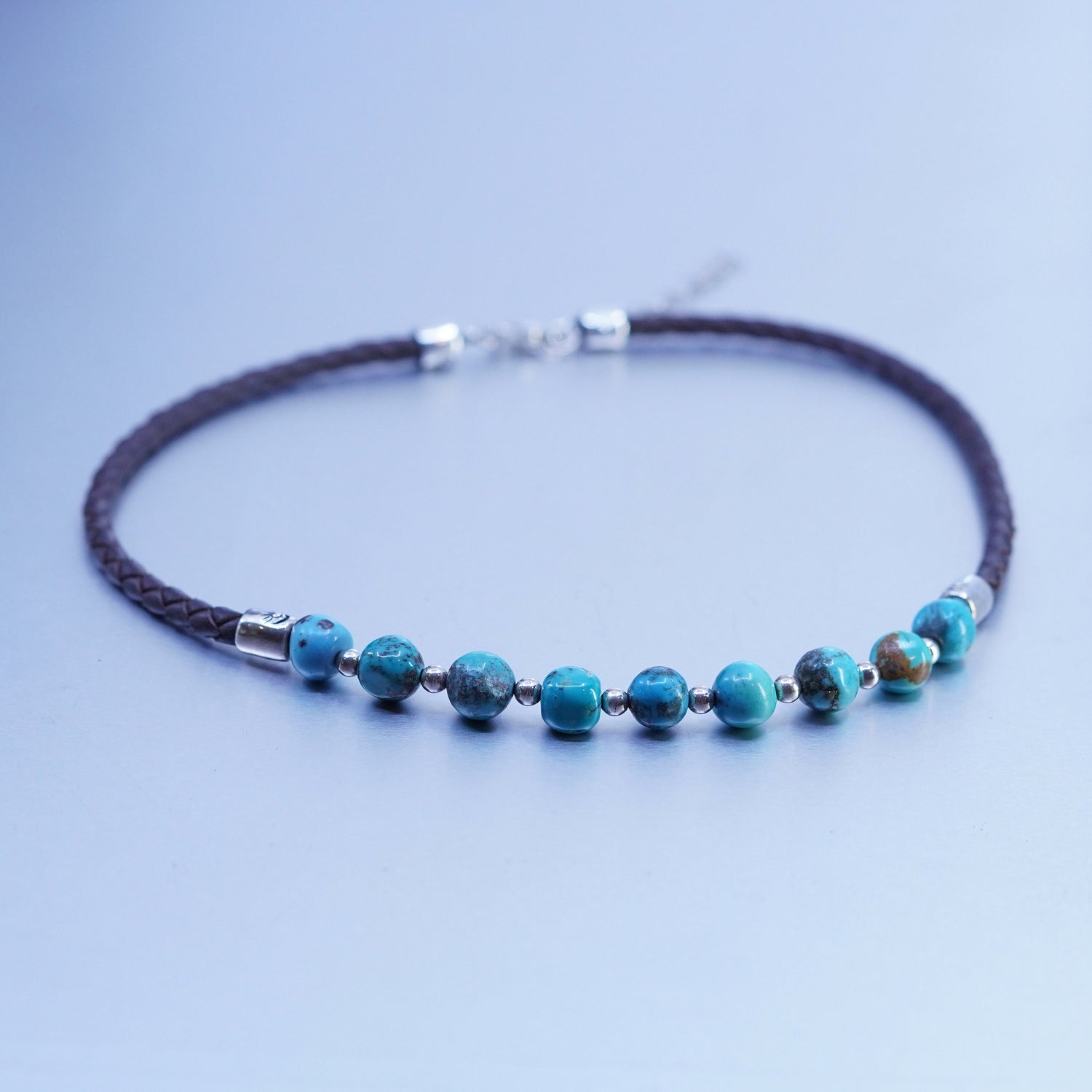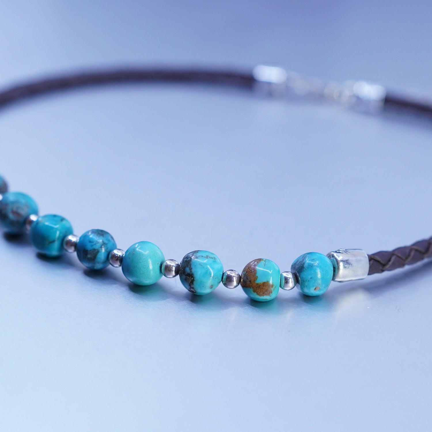 16+3" 5mm, vintage southwestern 925 Sterling Silver handmade woven brown Leather choker Necklace with turquoise beads, stamped 925