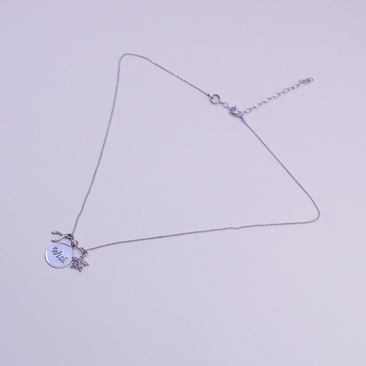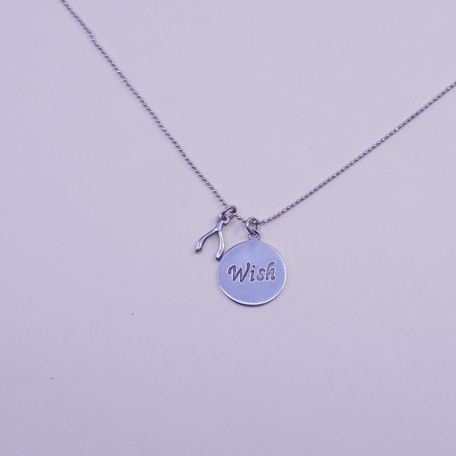 16+3", vintage sterling 925 silver handmade bead chain necklace with wish tag, wish bone and shooting star charms, stamped 925