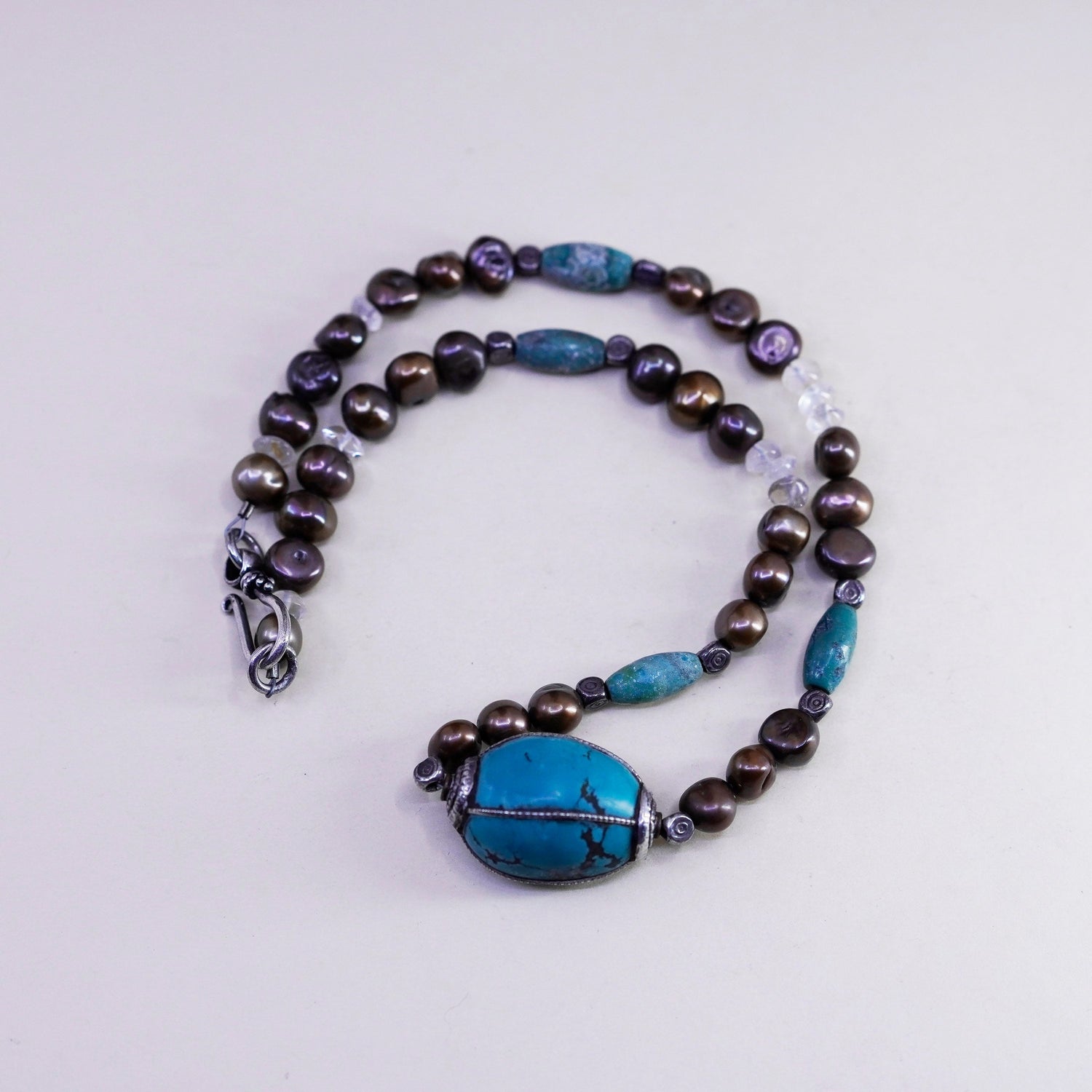 16", Vintage Sterling 925 silver clasp with pearl beads and nugget turquoise pendant, silver tested