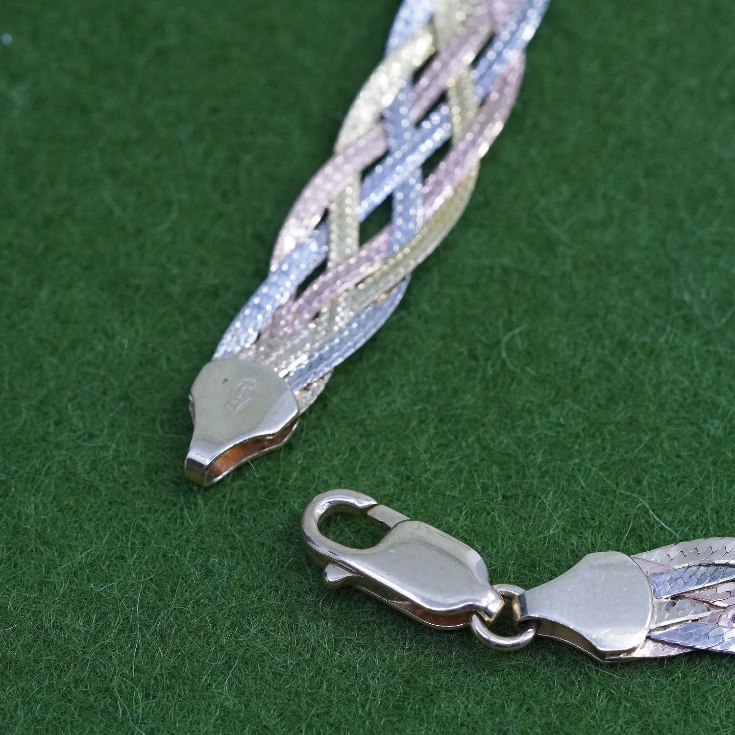 16", 8mm, Vintage triple tone yellow gold sterling silver necklace, 925 woven braided herringbone chain, stamped 925 Italy