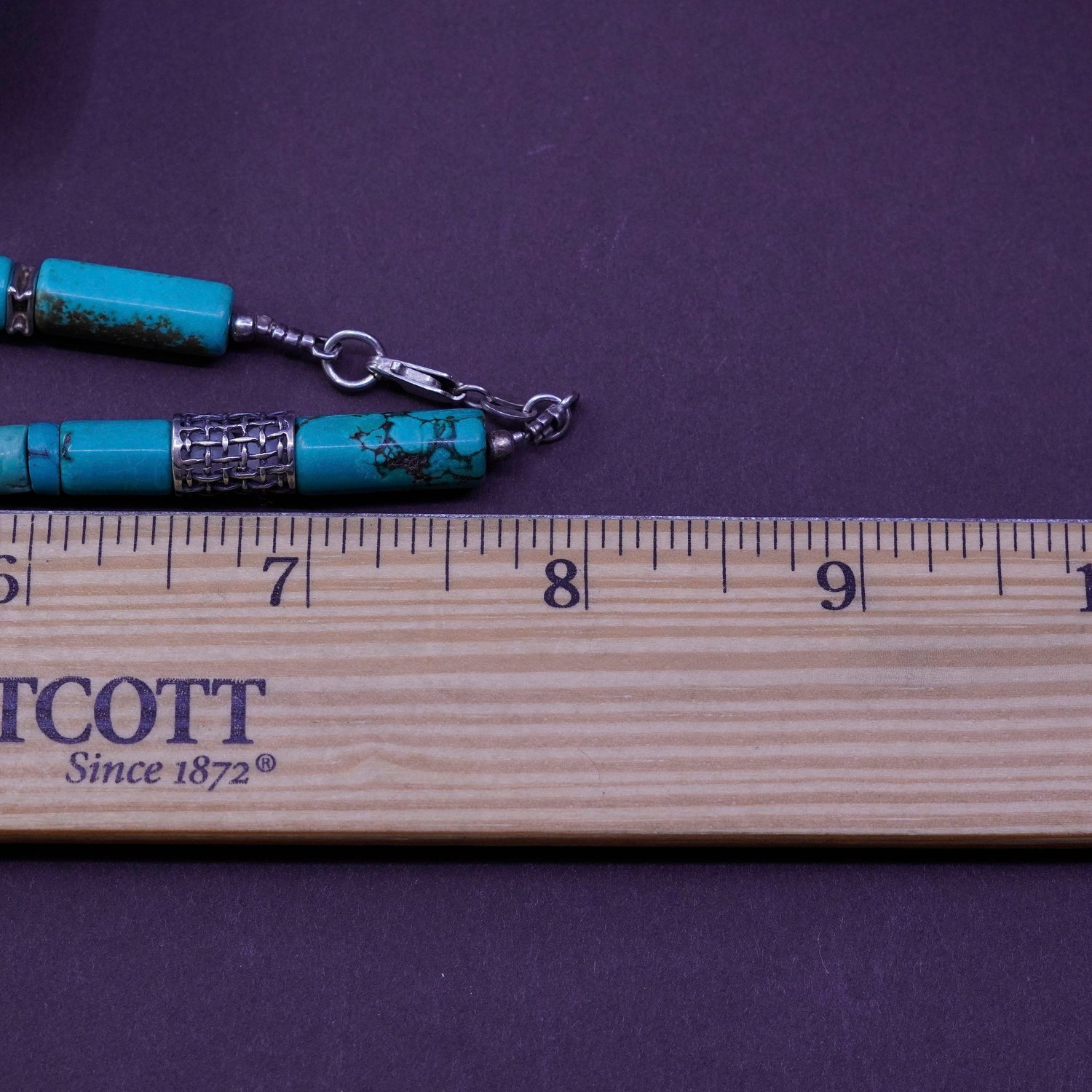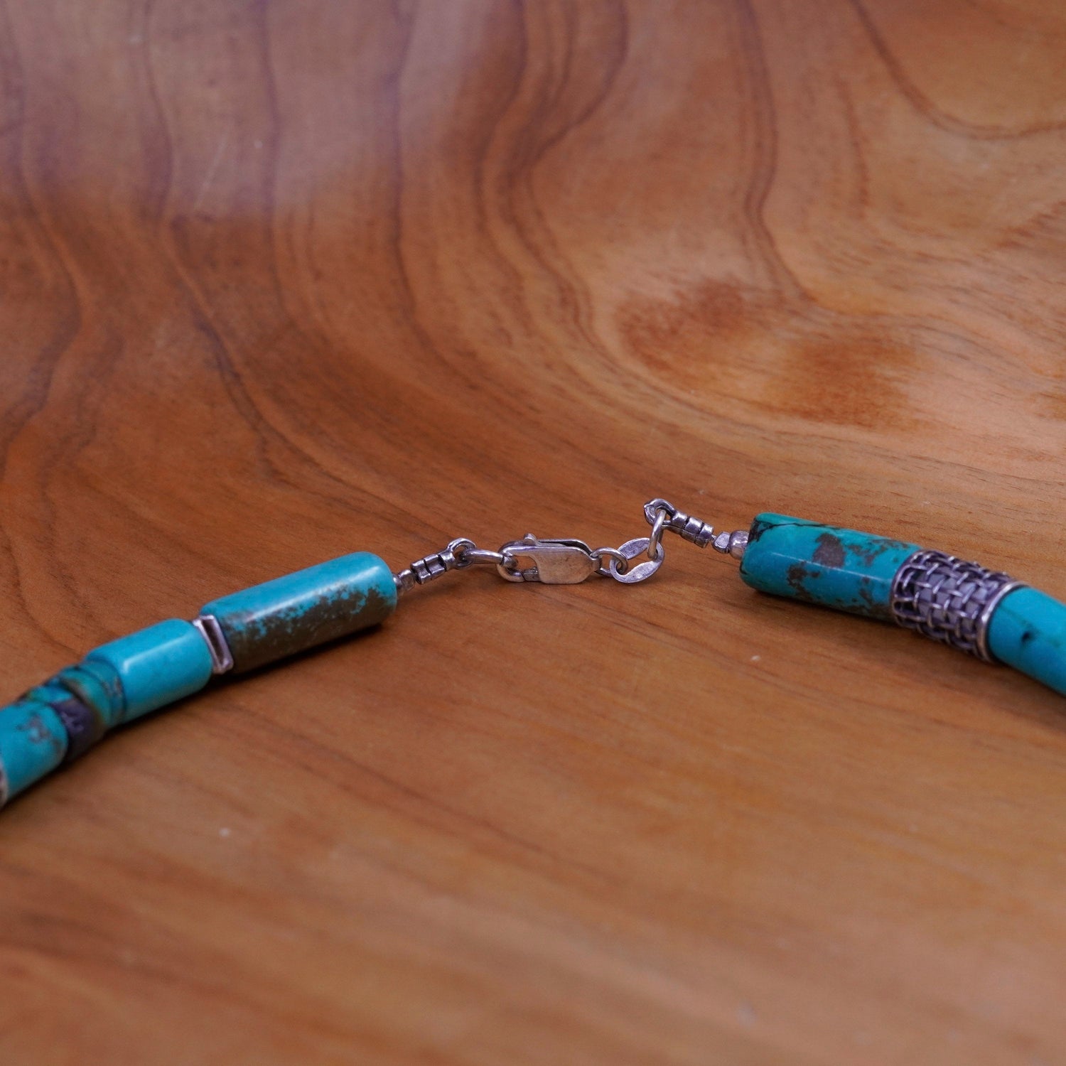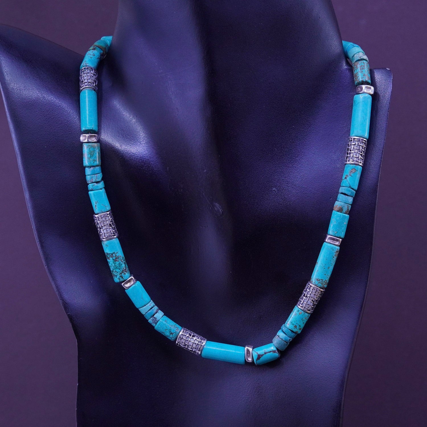 16". Vintage Native American heishi handmade necklace with turquoise tube beads, stamped 925