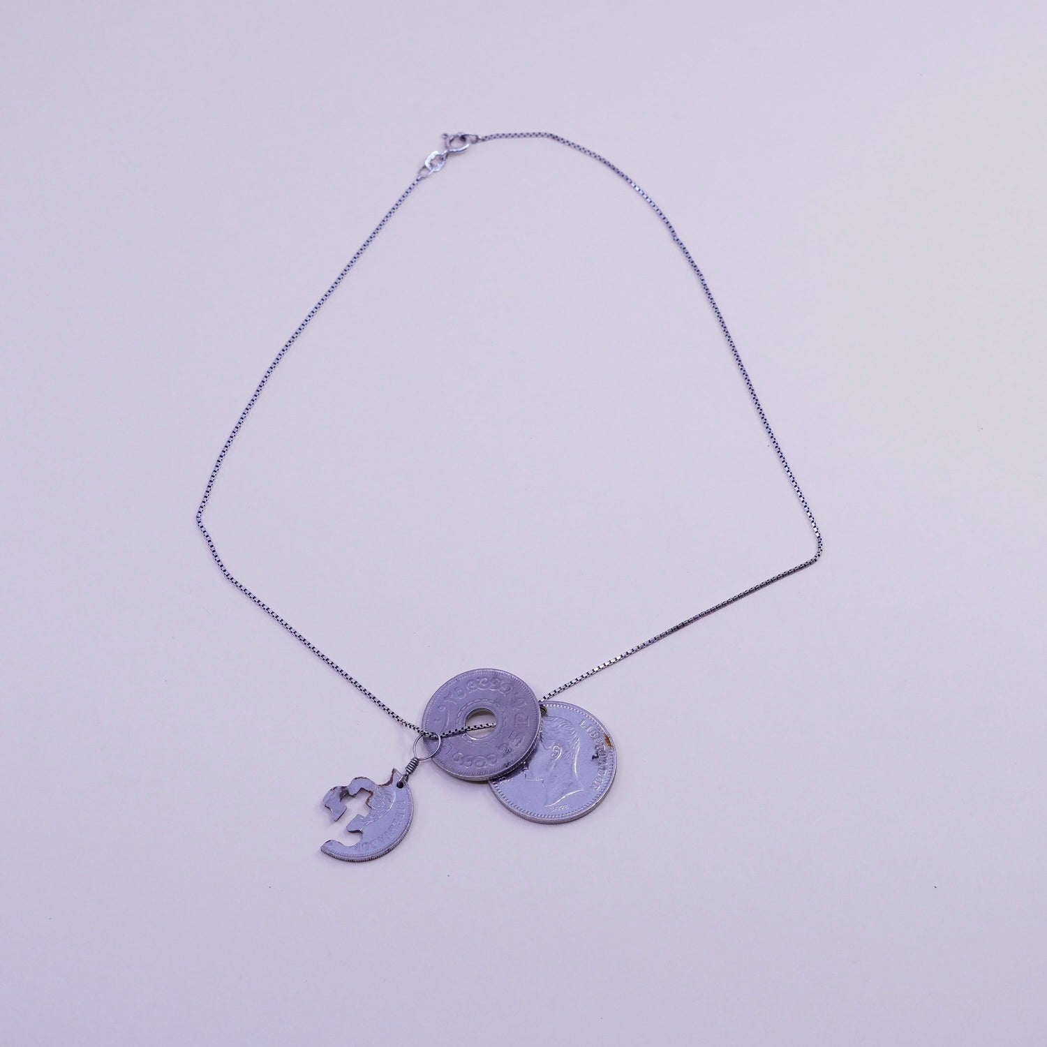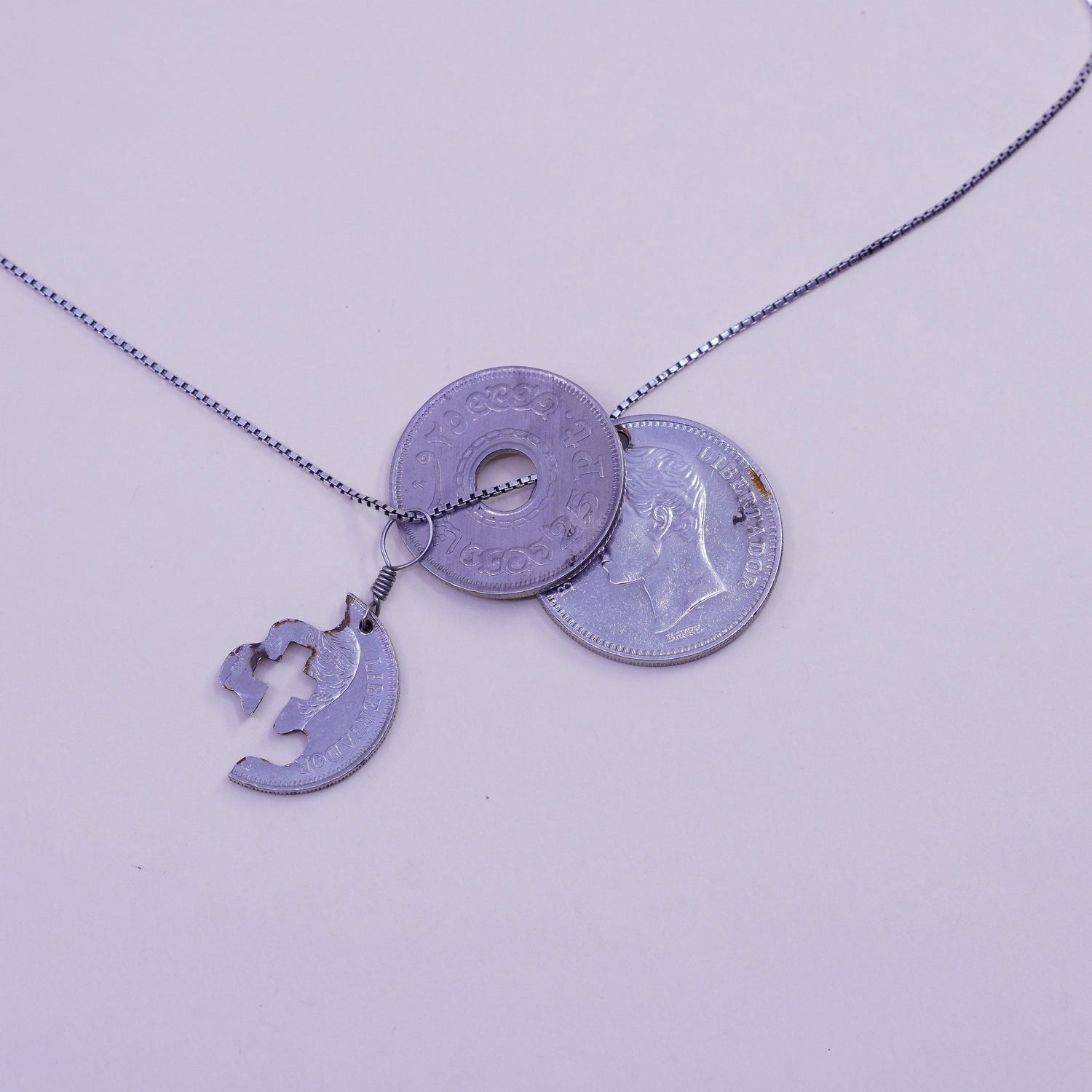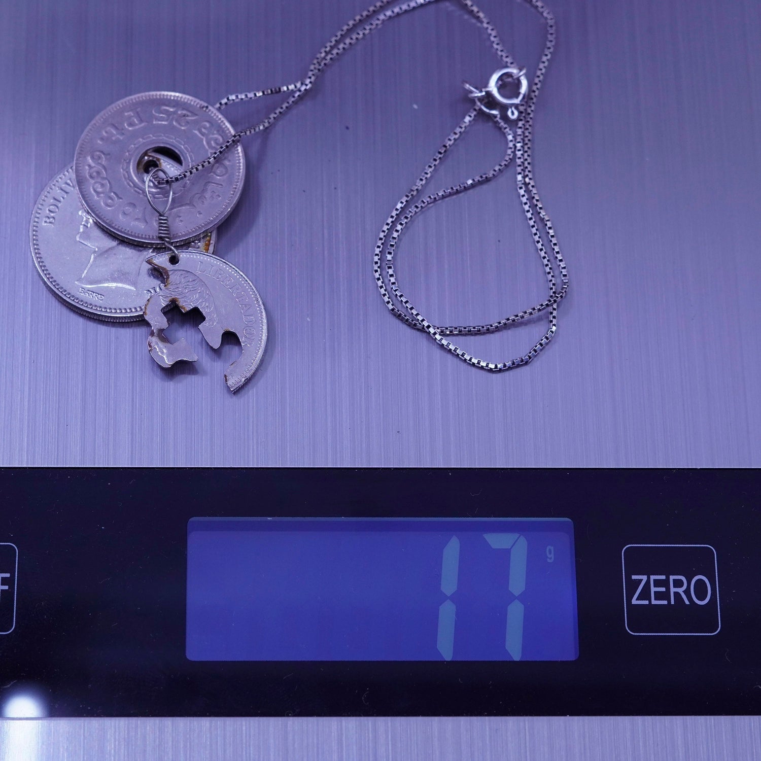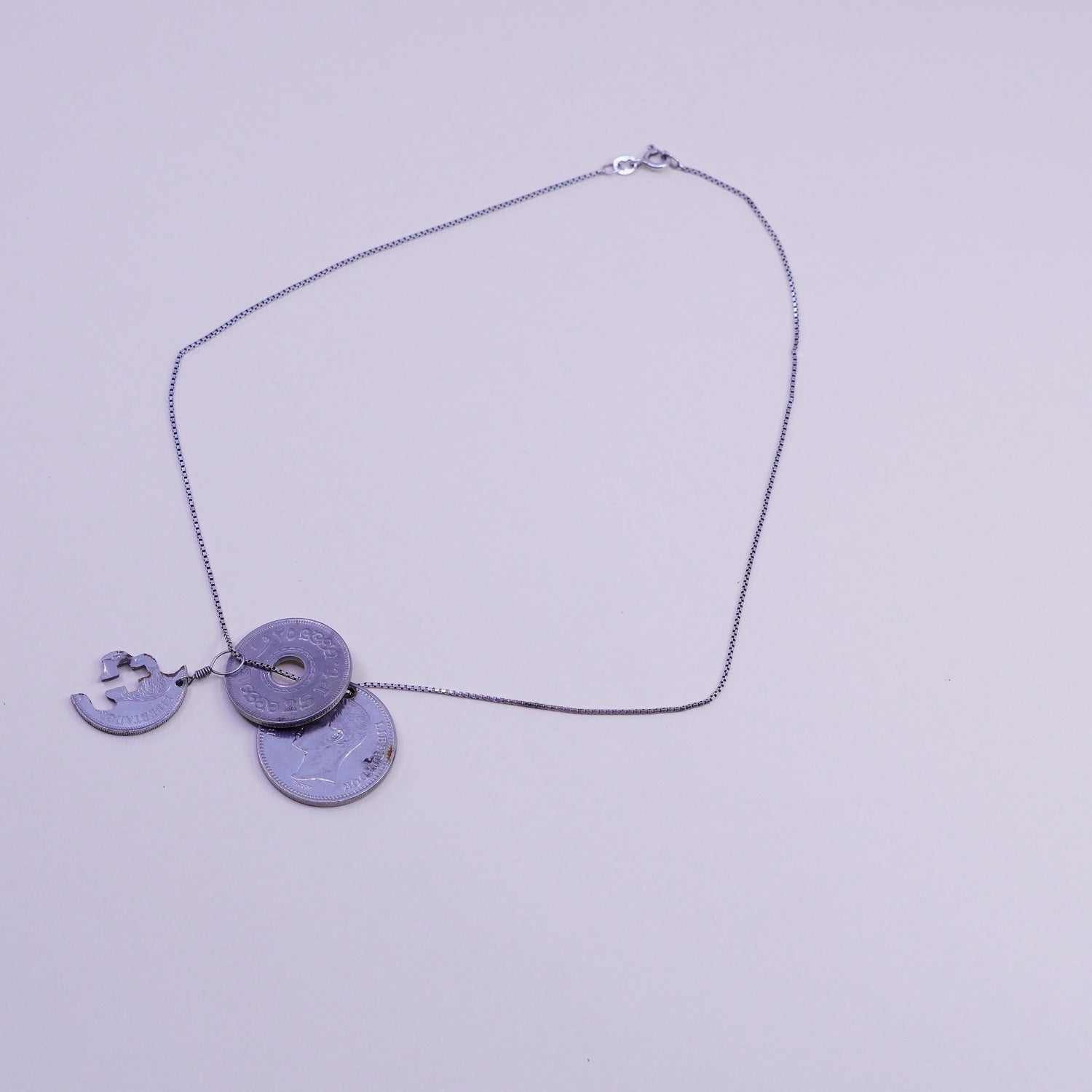 16", vintage Sterling 925 silver necklace, box chain with antique coins, stamped 925