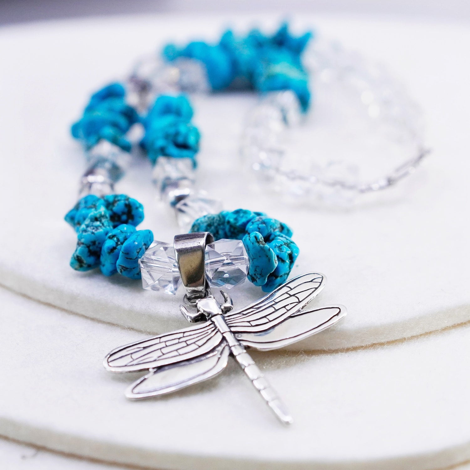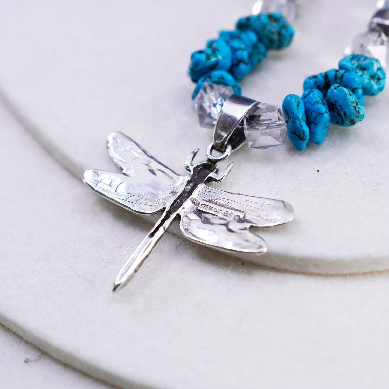17", Native American Sterling 925 silver Glenn Sandoval GS necklace with nugget spiderwebbed turquoise and dragonfly pendant, stamped sterling GS