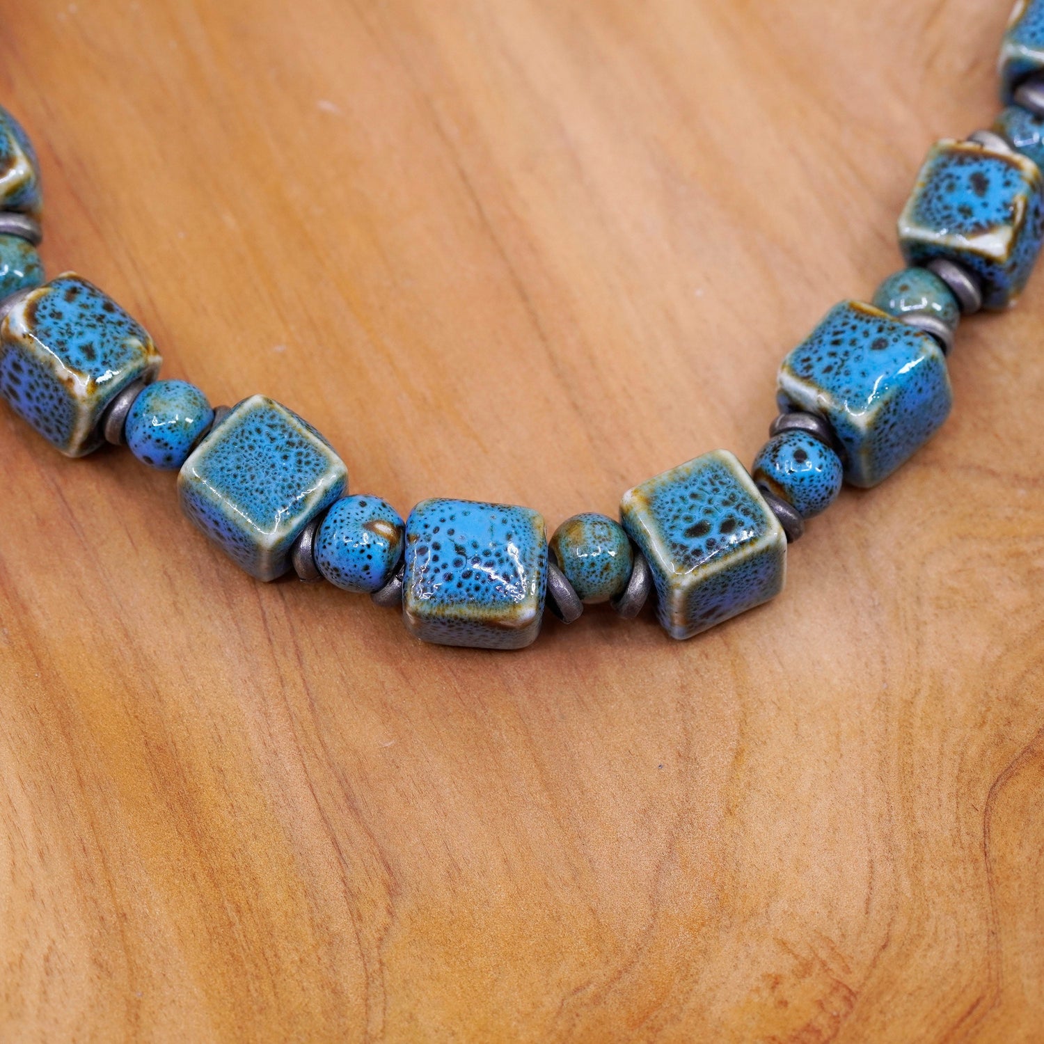 17” sterling 925 silver handmade bead necklace with blue dotted ceramic cube