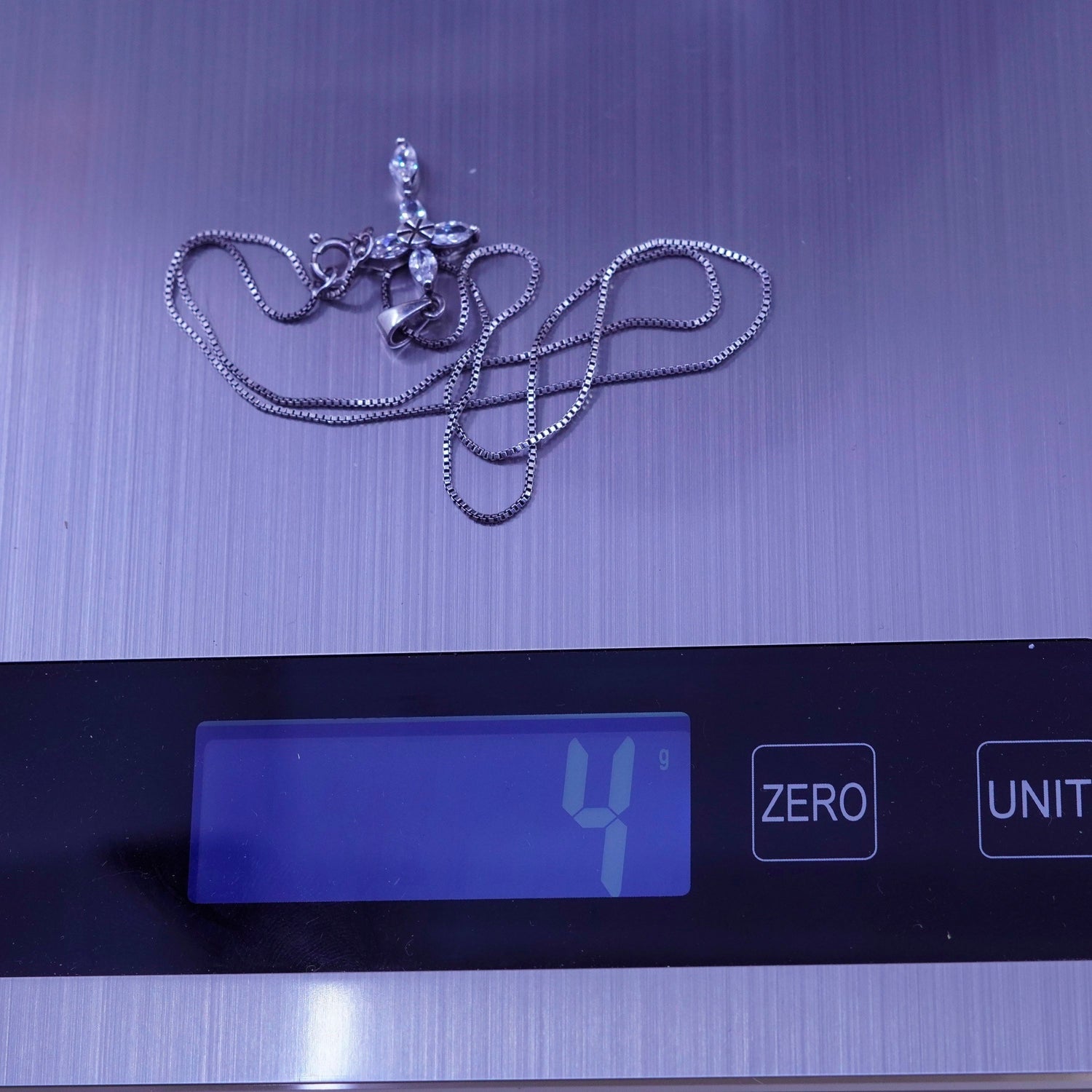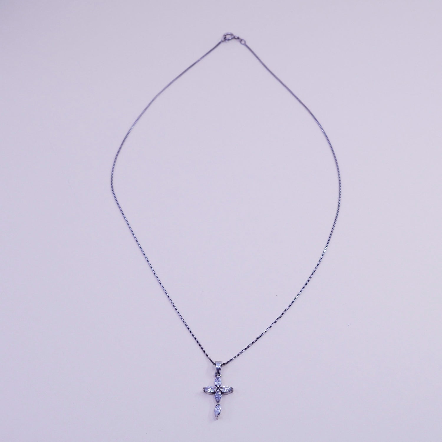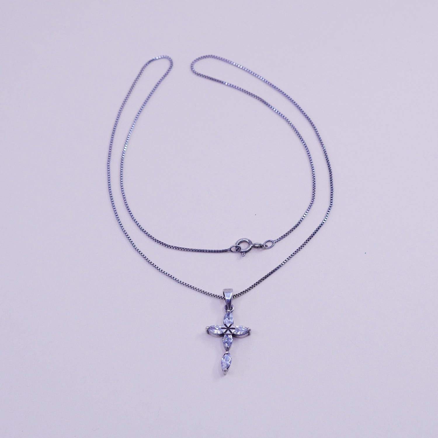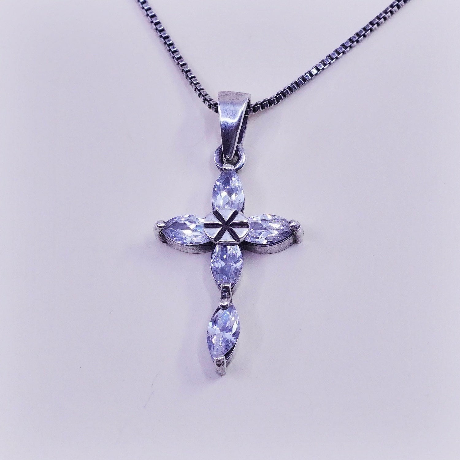 18", 1mm, Vintage sterling silver box chain with cz cross pendant, necklace, stamped 925