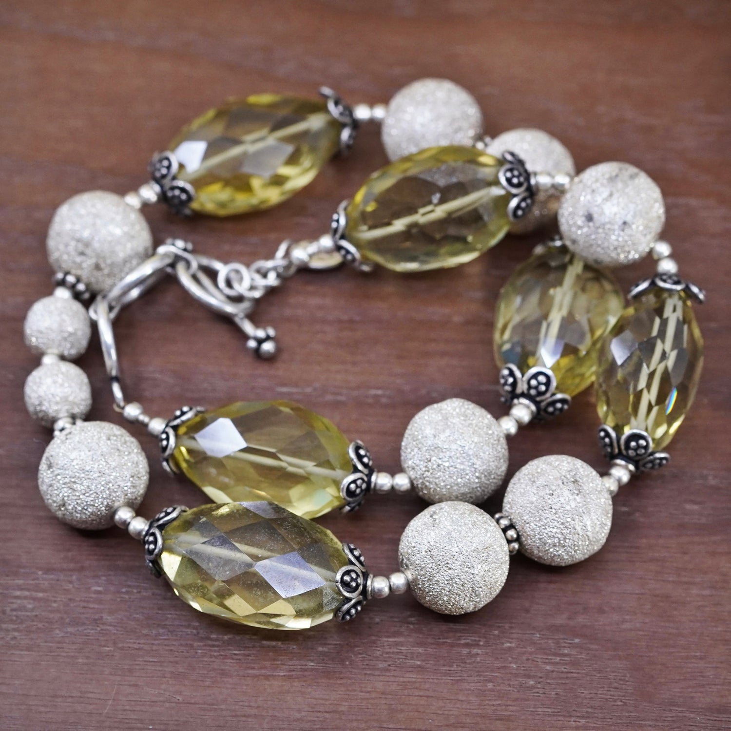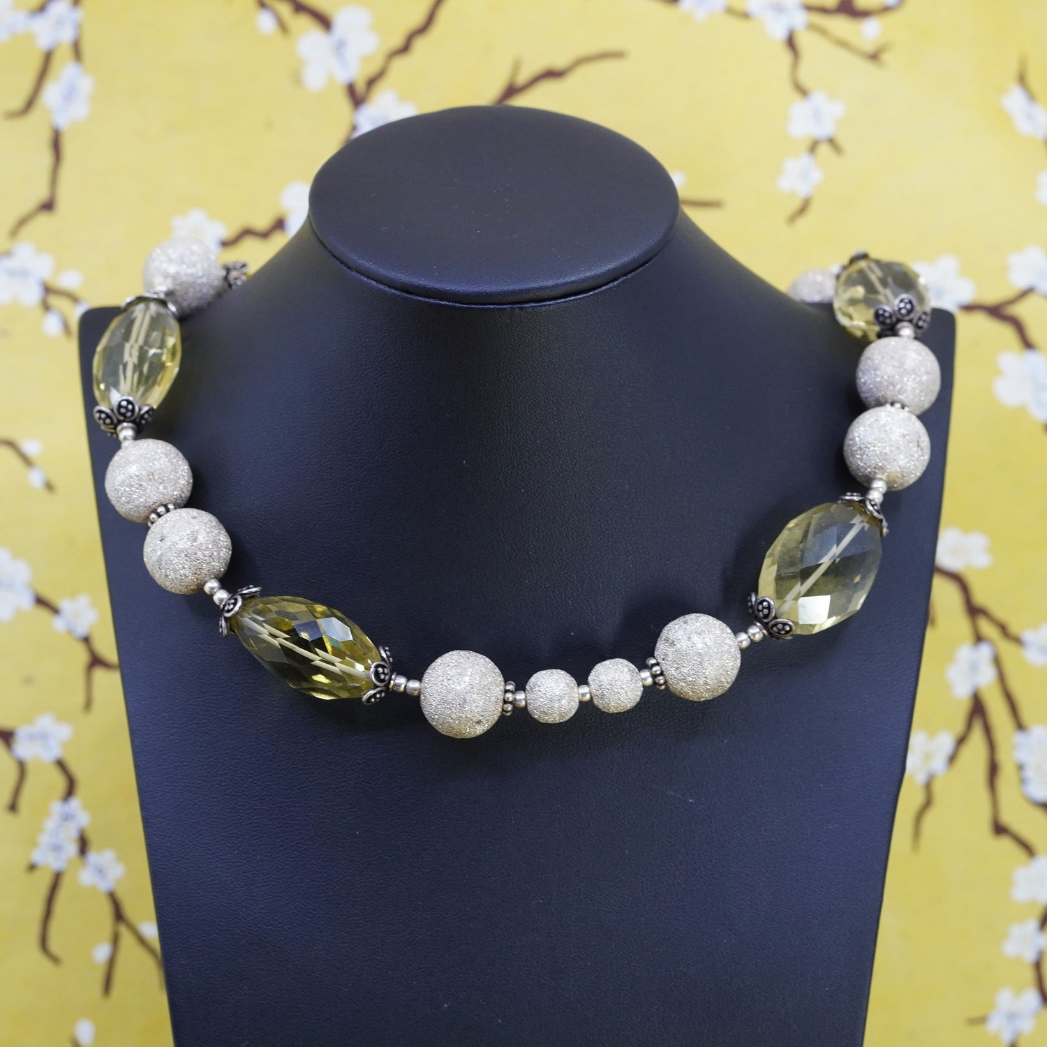 18", vintage Amy Kahn Russell AKR Sterling Silver 925 glittering bead ball with olive colored citrine, stamped 925 AKR