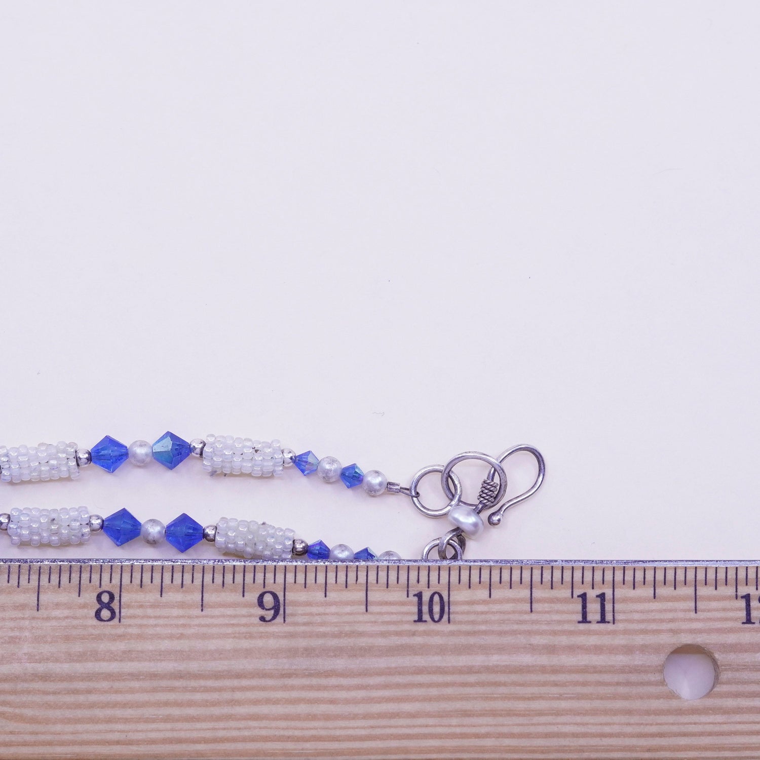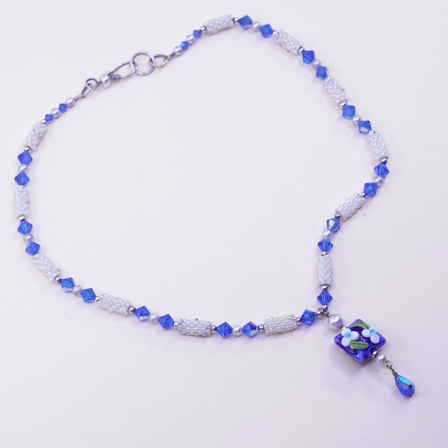 18", Vintage handmade Sterling 925 silver pearl necklace with blue beads and glass flower, stamped 925
