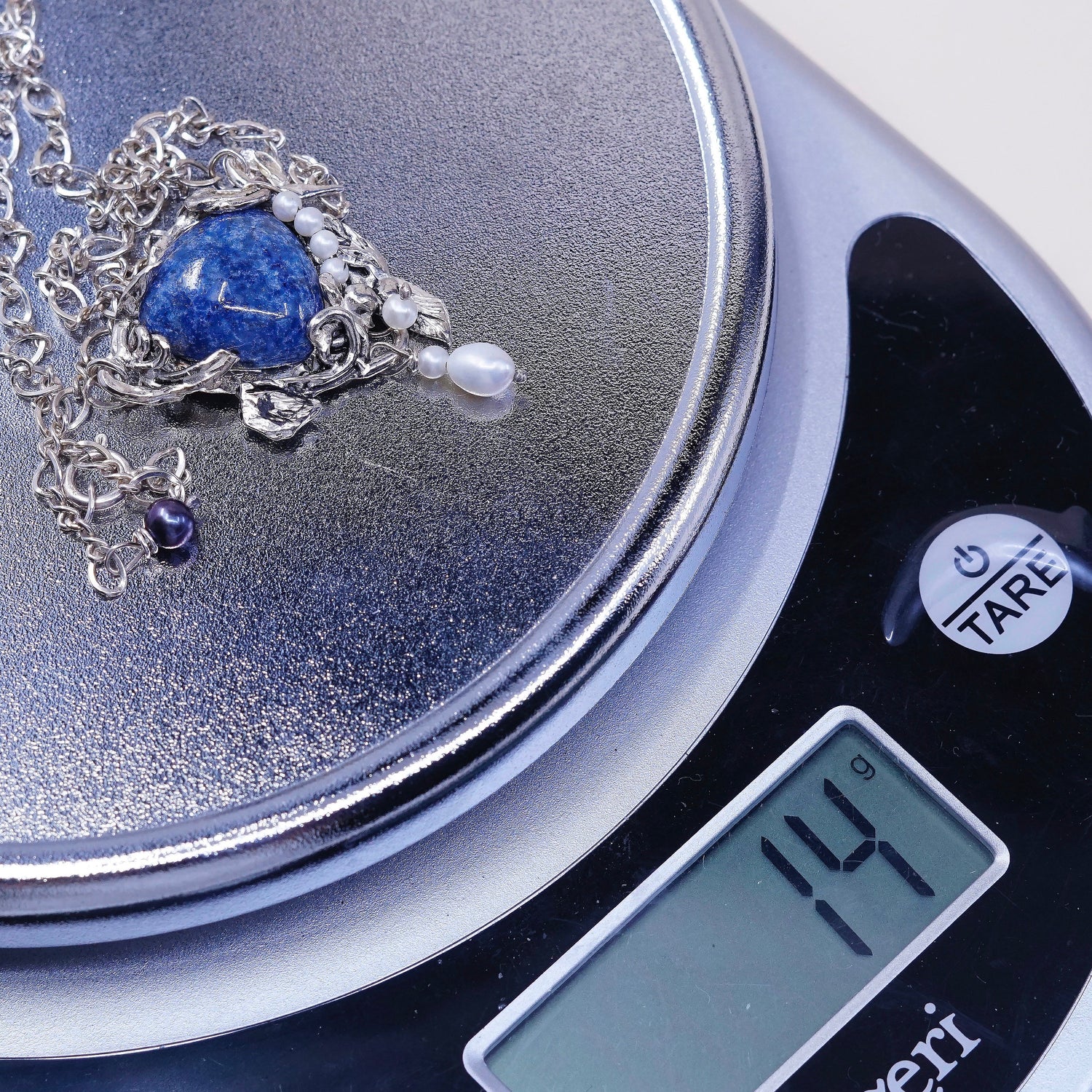 18", vintage Israel sterling silver 925 necklace, figaro chain with sodalite pendant and pearl dangle, stamped 925