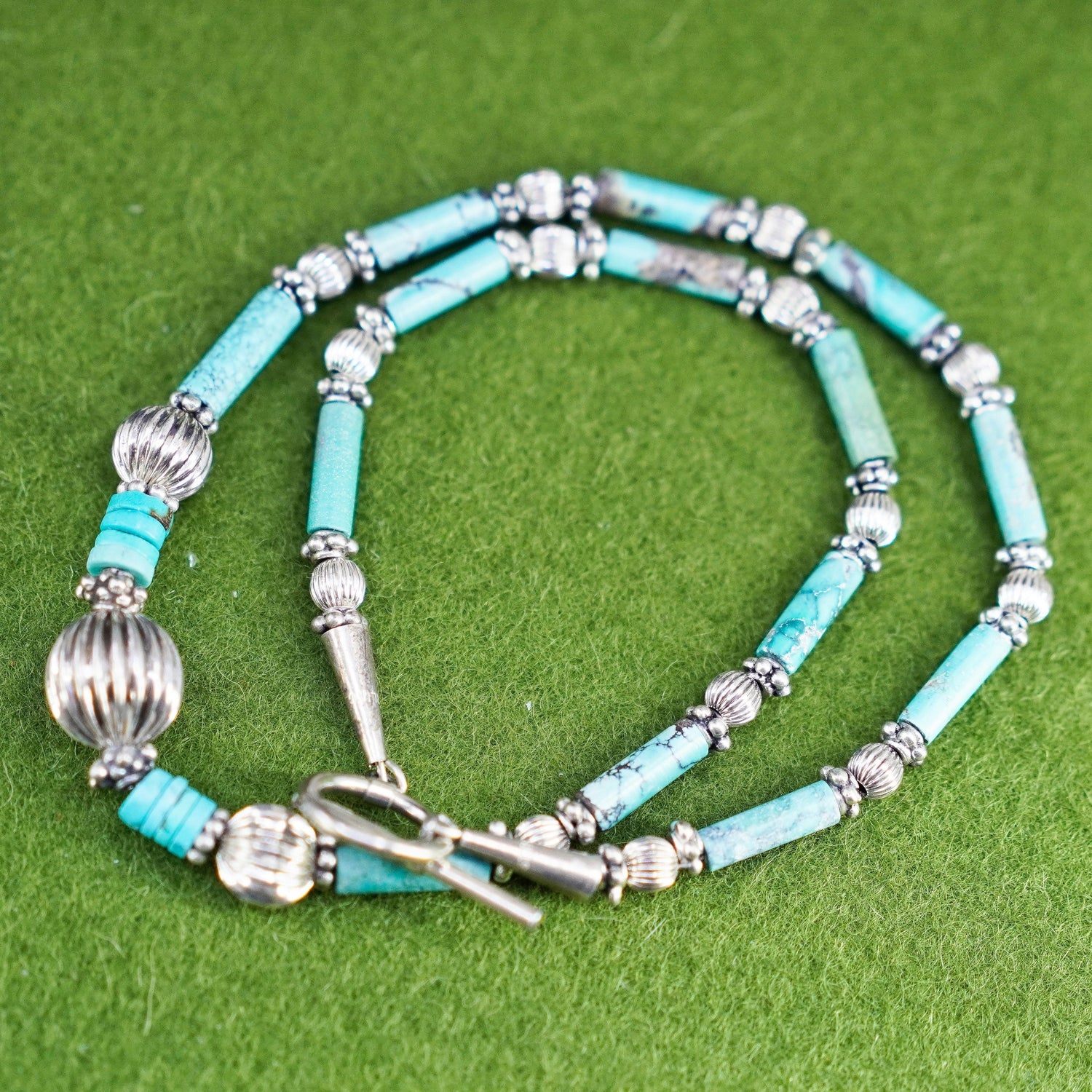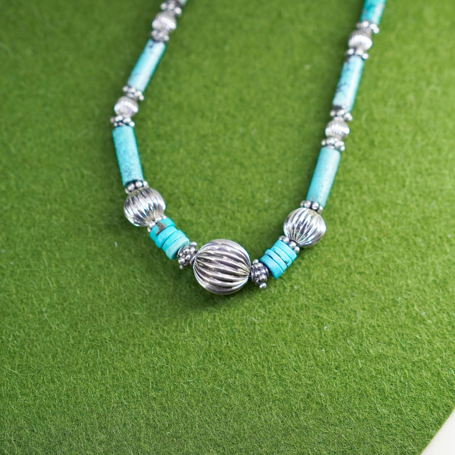 18”, Native American Navajo Sterling necklace, 925 silver beads turquoise tubes