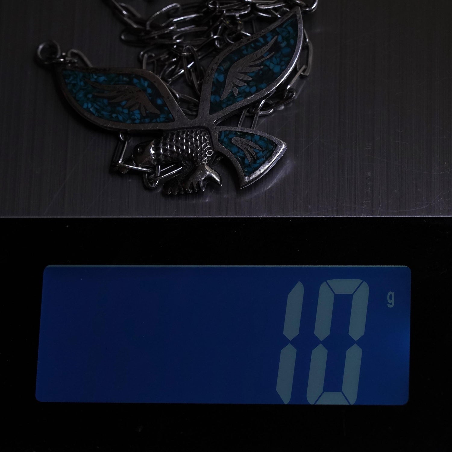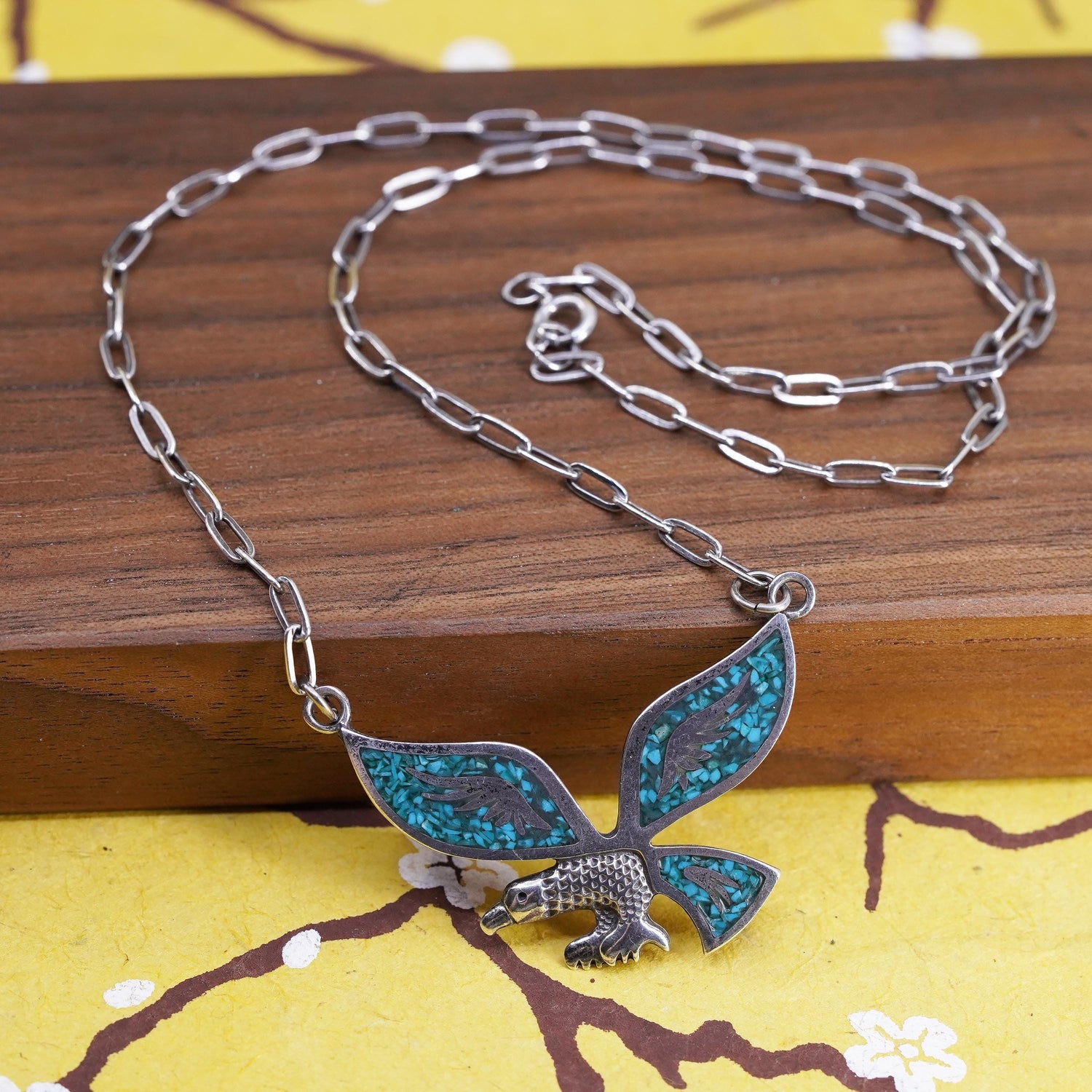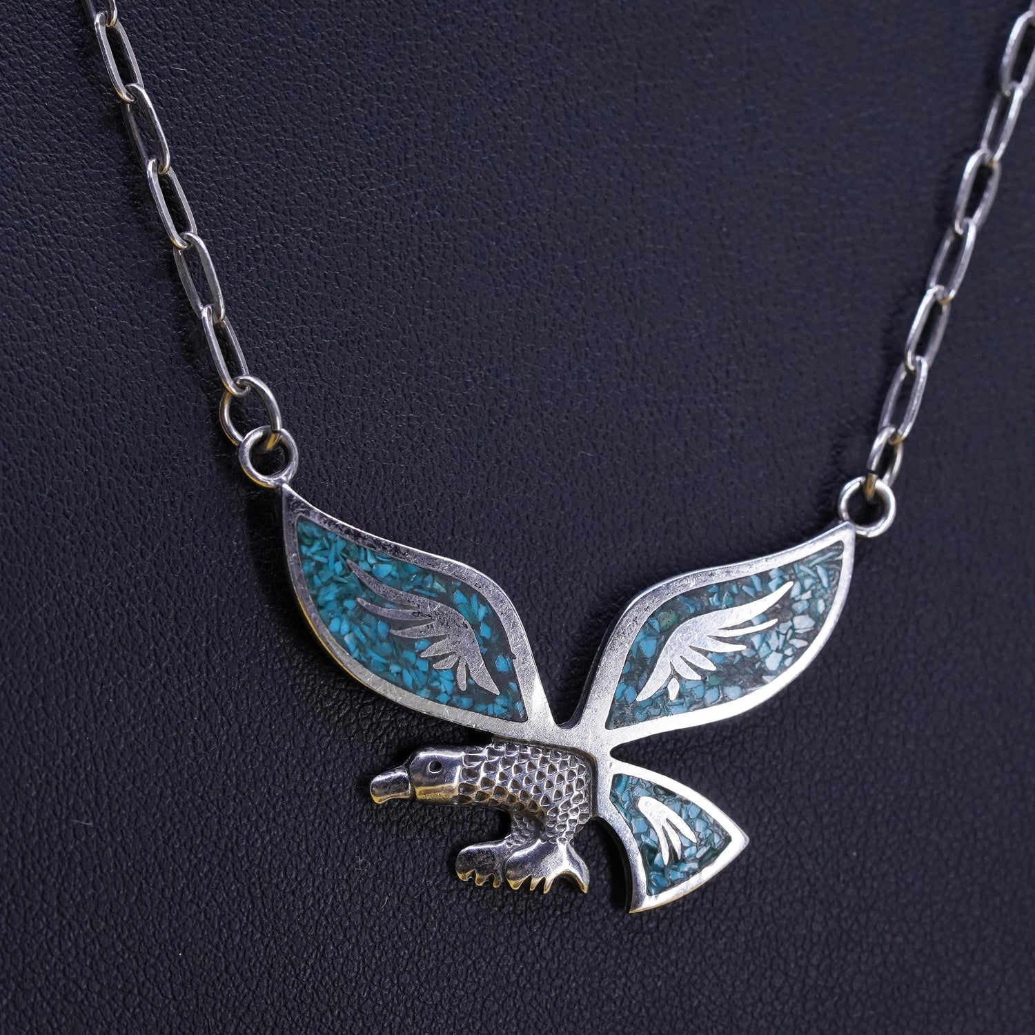 18" Vintage Native American Sterling 925 silver handmade elongated chain necklace with eagle pendant with turquoise inlay, stamped 925