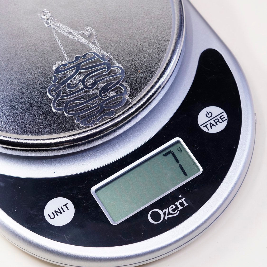 18", sterling silver handmade necklace, circle chain w/ monogram “KDR” pendant