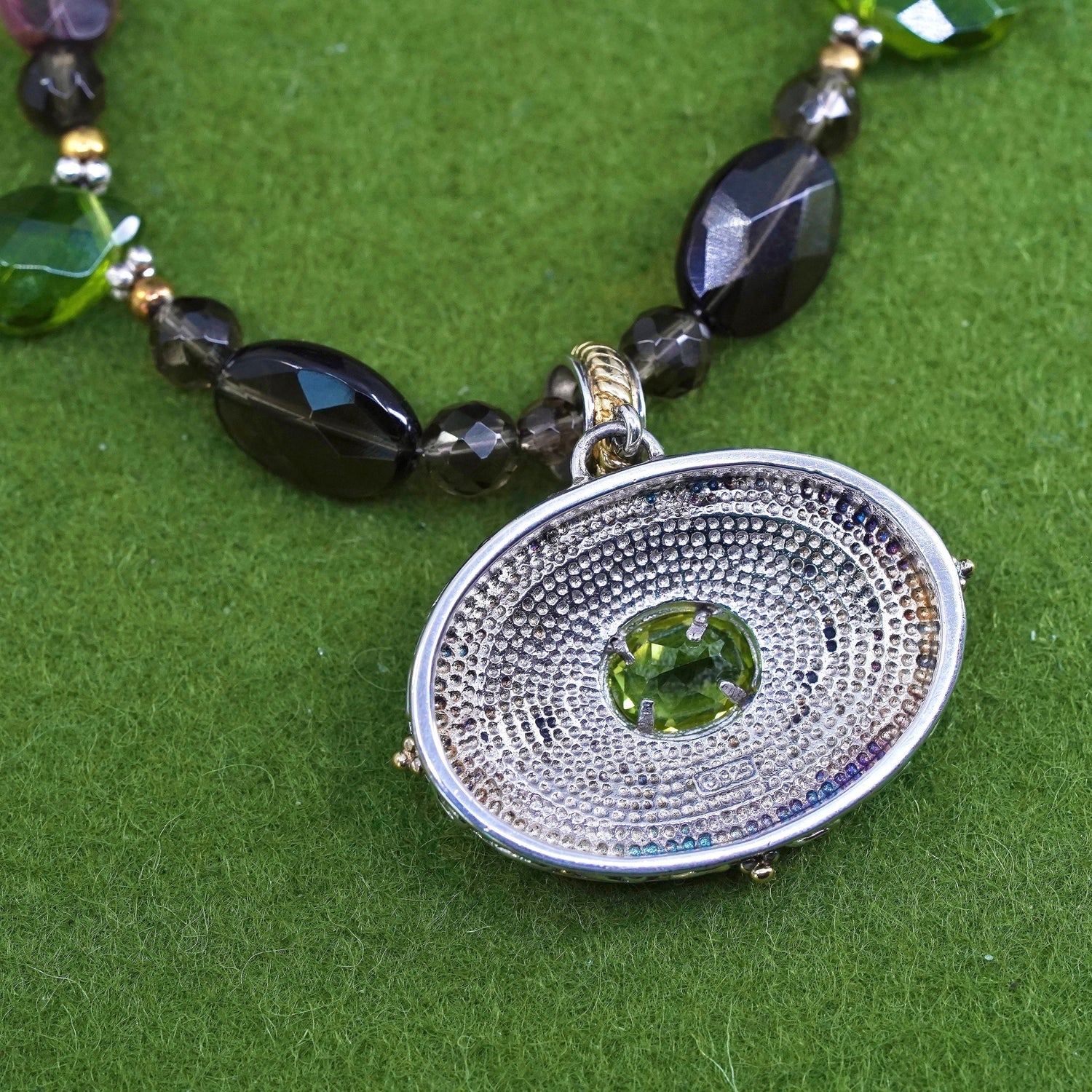 18", Vintage two tone smoky quartz and peridot bead necklace with oval peridot pendant and toggle closure, Stamped 925