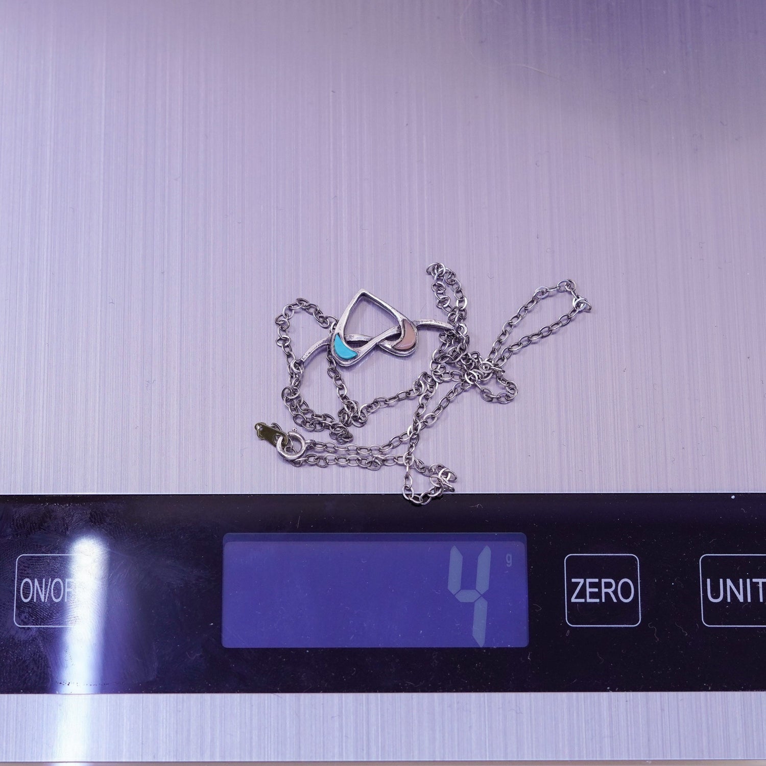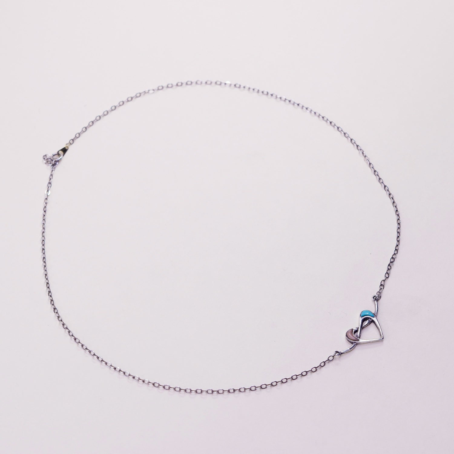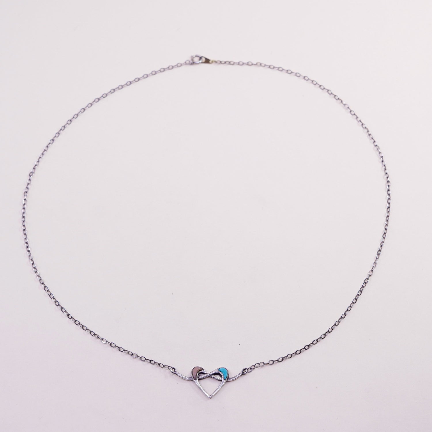 19", Vintage Native American bell trading post Sterling silver handmade necklace, 925 circle chain with heart pendant and turquoise coral, stamped Sterling