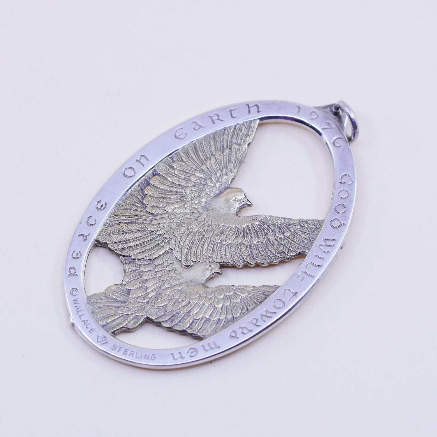 1976 Sterling 925 Silver Wallace Peace on Earth Oval Dove pendant, Ornament Jewelry, stamped Sterling Wallace
