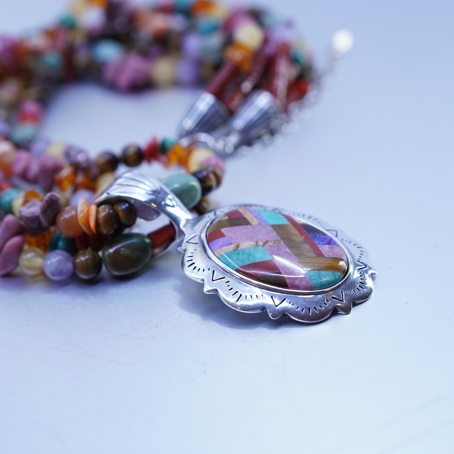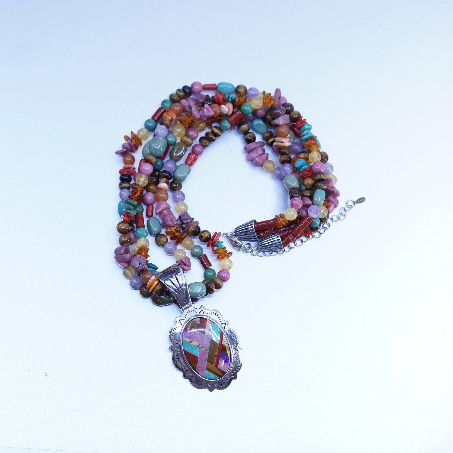20+3", vintage Native American Sterling 925 silver multi stone beads necklace with inlay oval pendant, stamped 925
