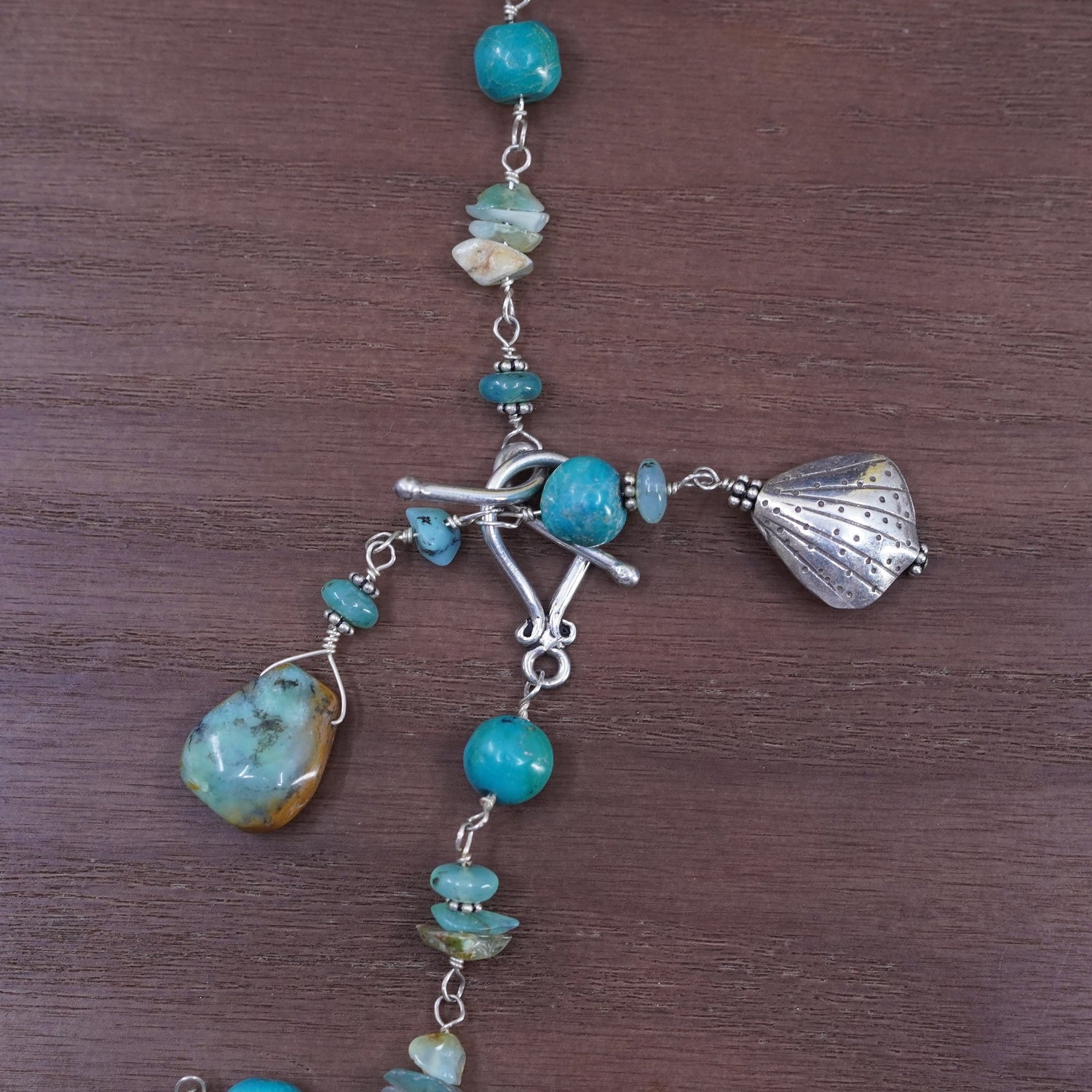20". Native American handmade handmade necklace with turquoise beads and shell charms, silver tested