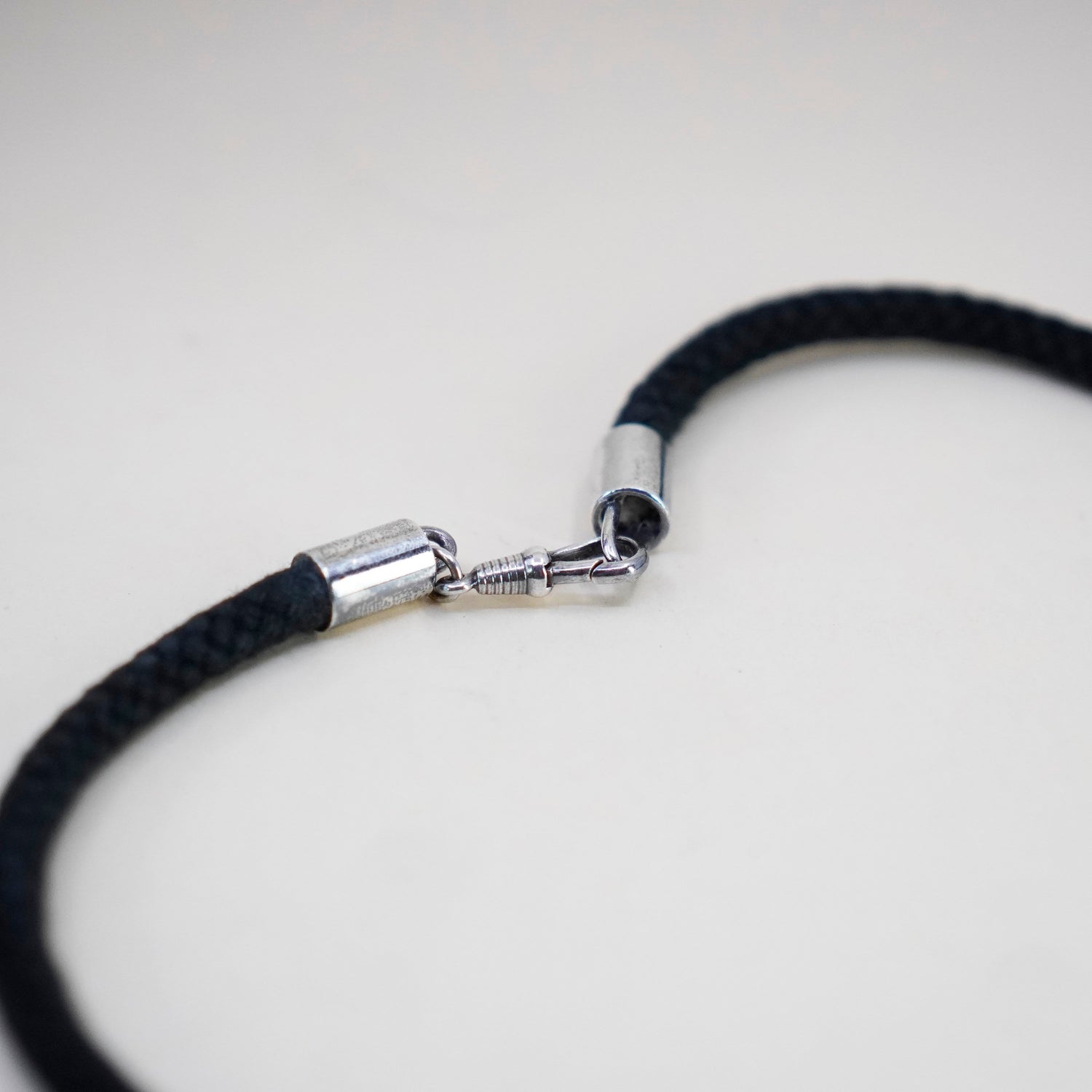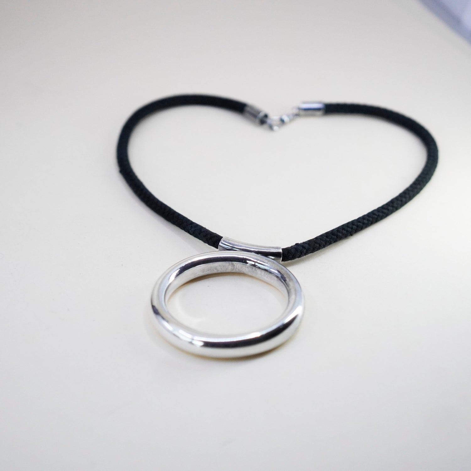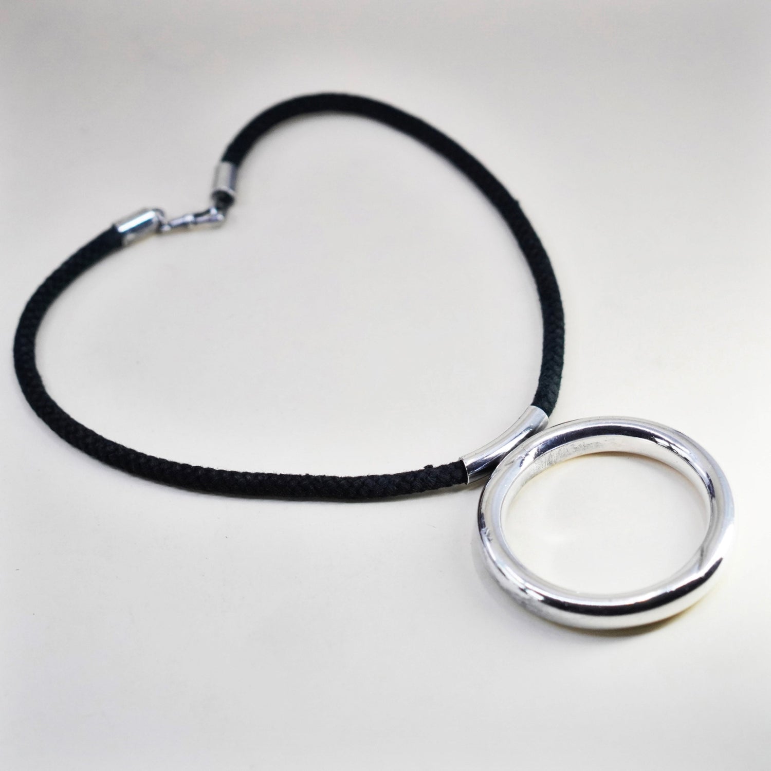 20", Vintage sterling 925 silver handmade necklace, huge round pendant with bold cotton thread, stamped 925