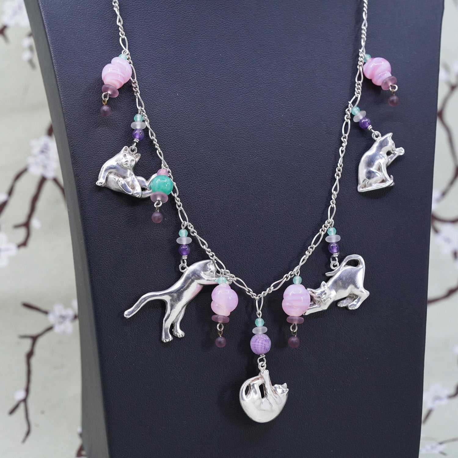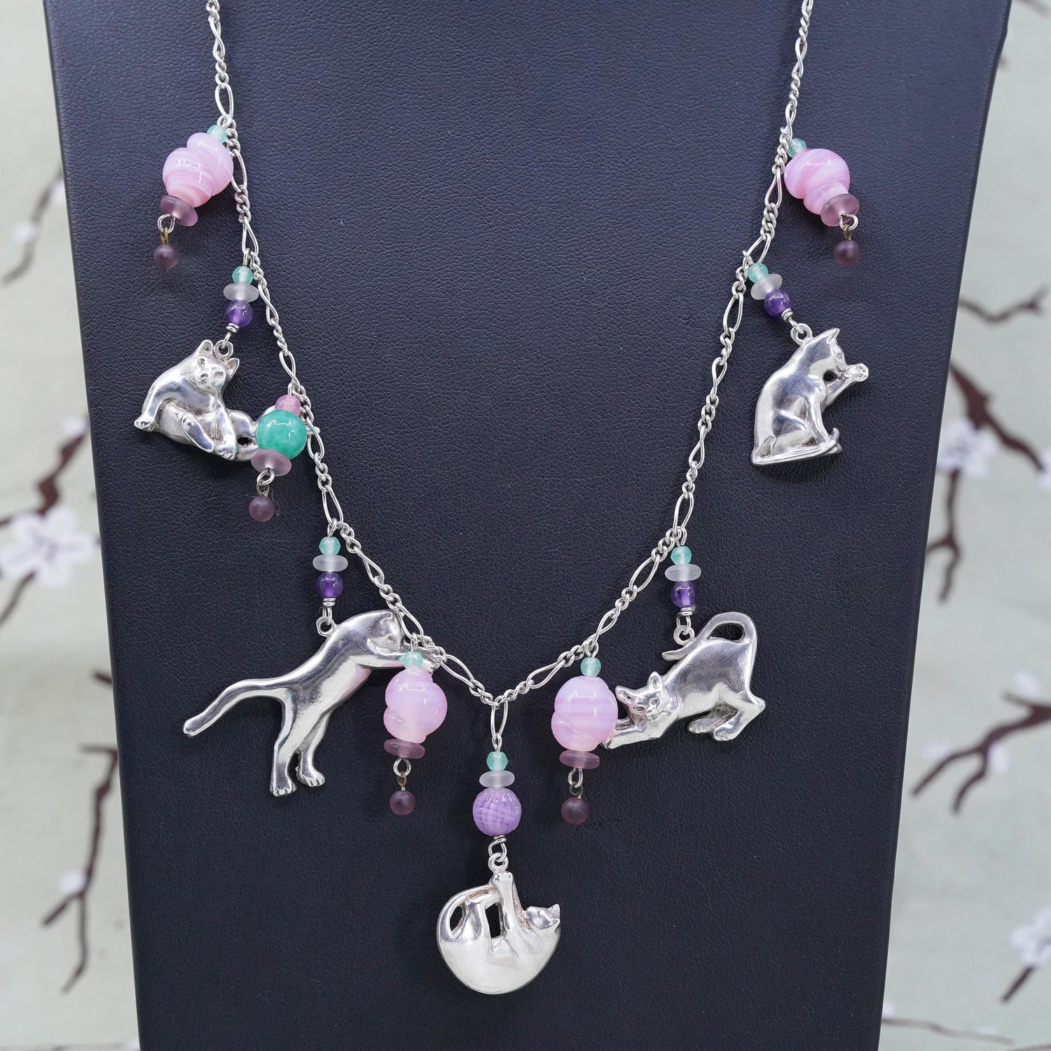 22" 3mm, Rare Southwestern sterling silver figaro chain with 925 cat pendants and pink crystal necklace, stamped 925