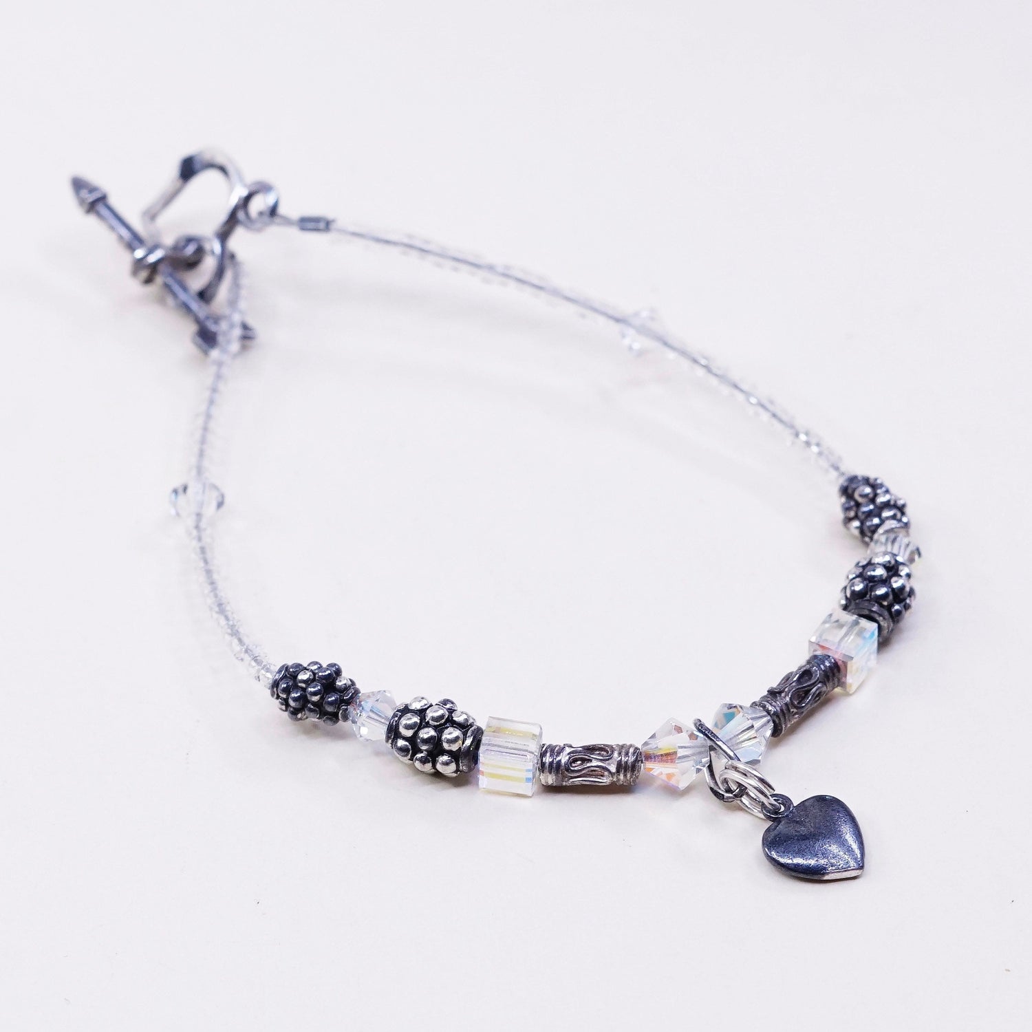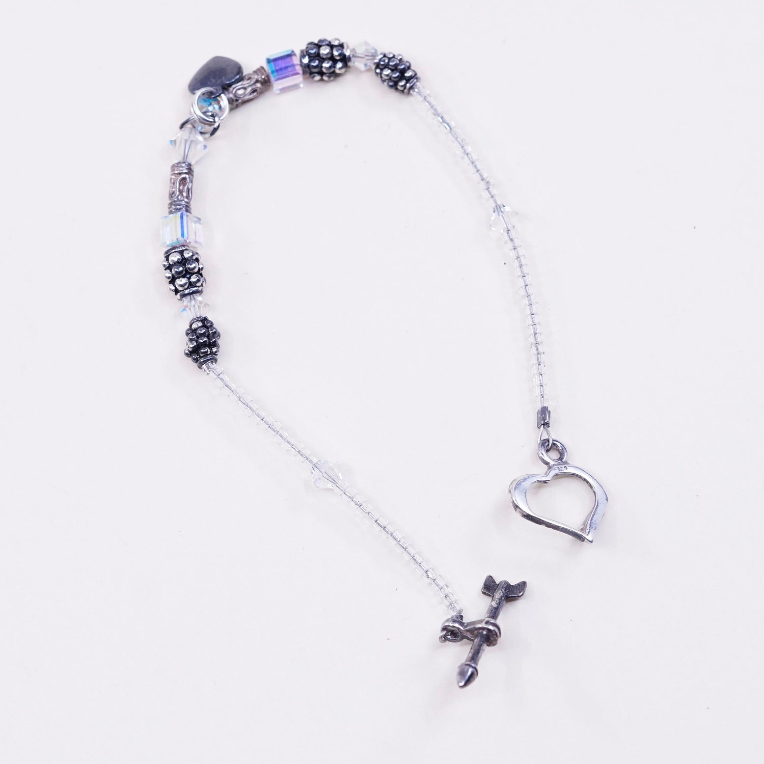 6.25", Vintage Sterling silver handmade bracelet, 925 heart charm with clear crystal and heart toggle closure, stamped 925