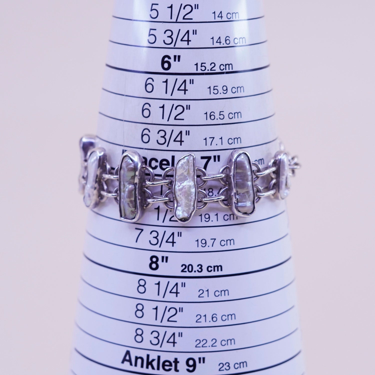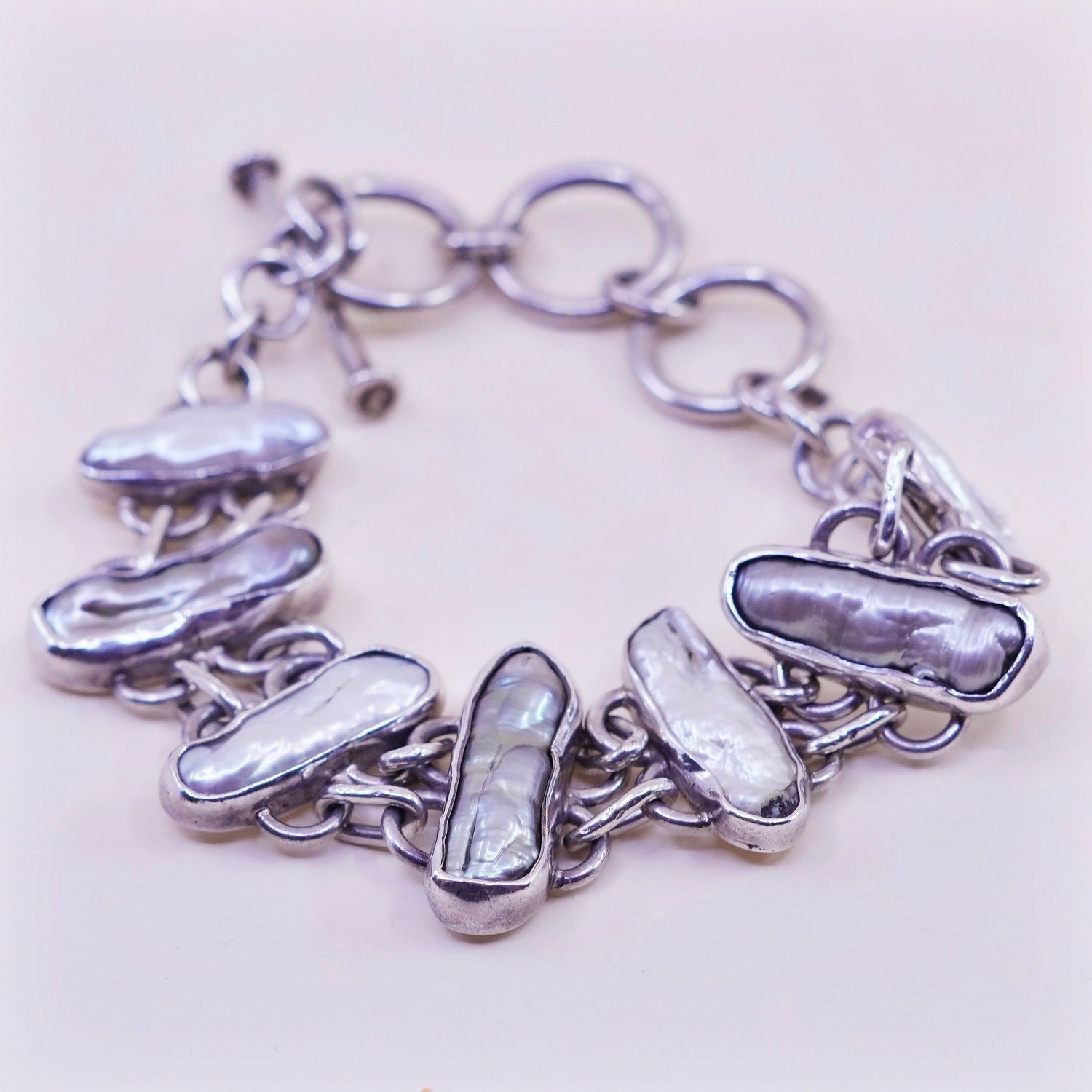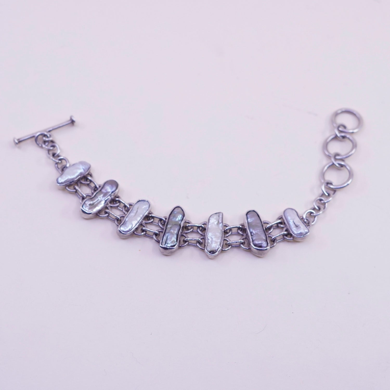 6.5+1", Vintage handmade Sterling 925 silver handmade bracelet with long pearl and toggle closure, stamped 925