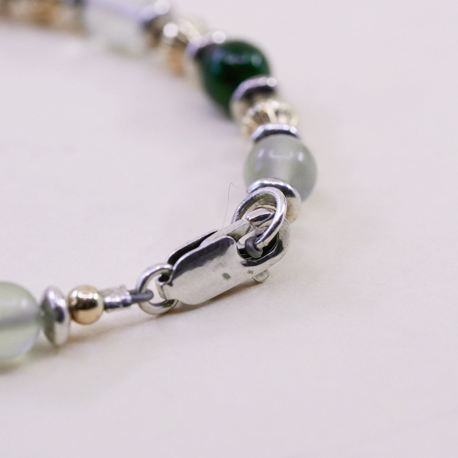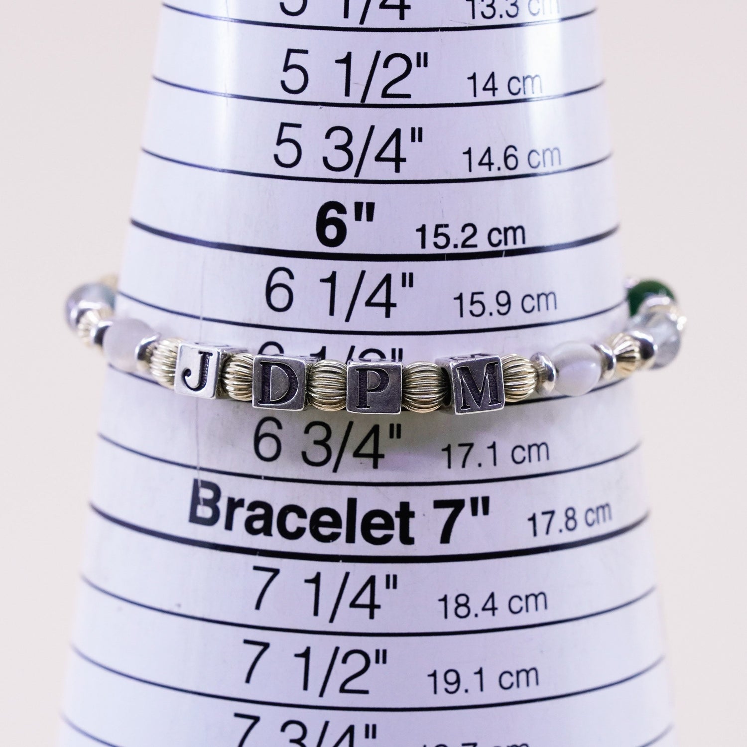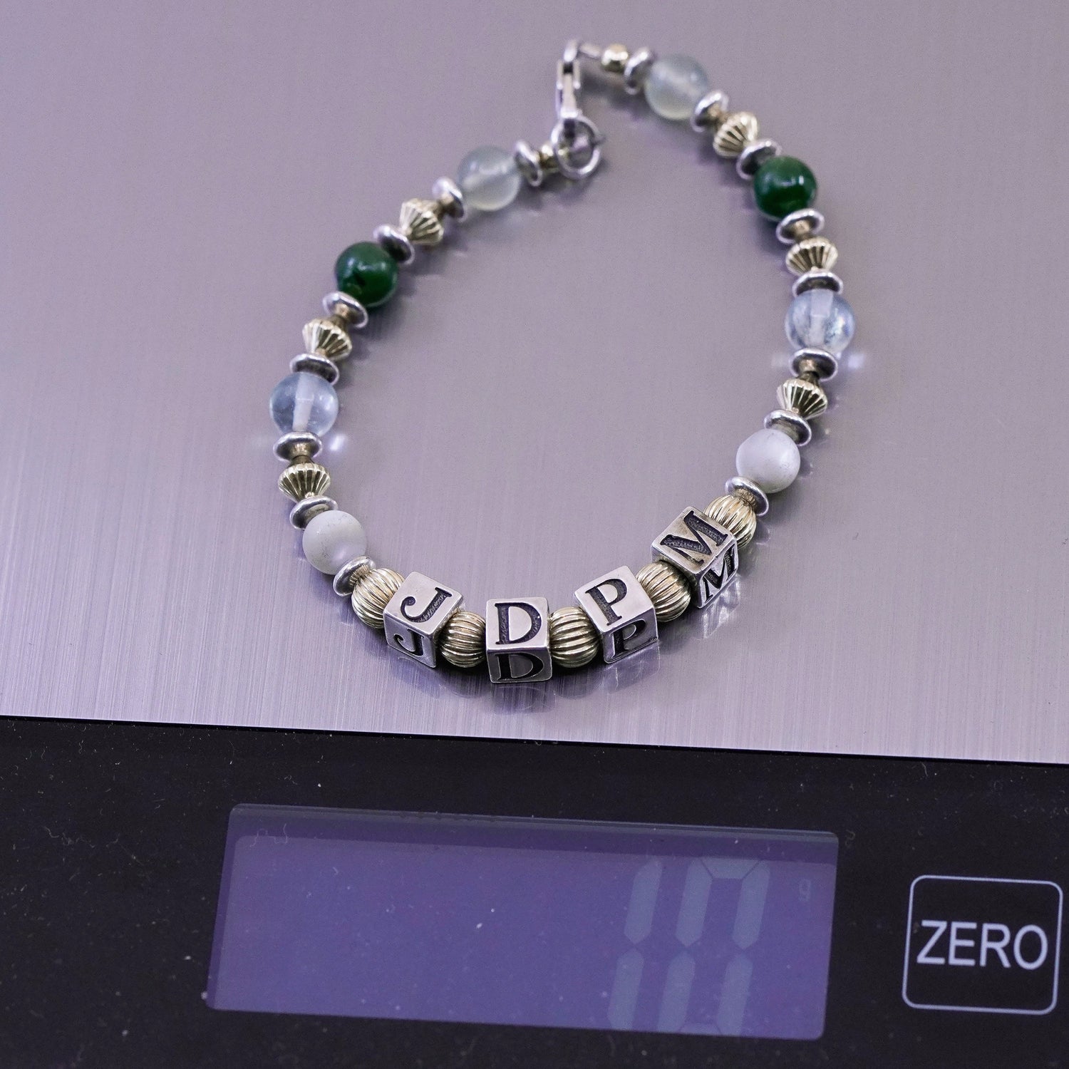 6.5", vintage handmade 14K gold beads with Sterling 925 Silver prehnite jade beads bracelet with initial "JDPM" cubes, stamped 925