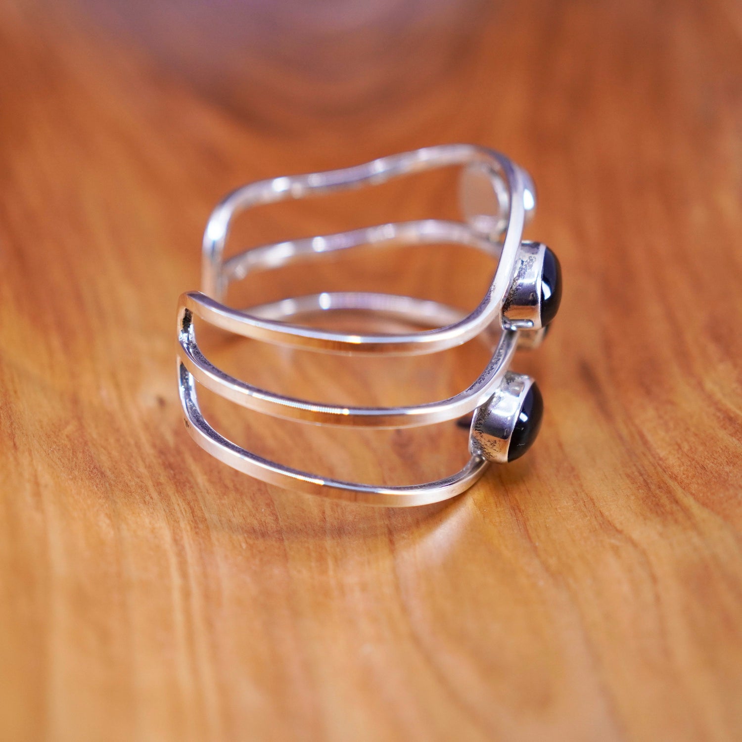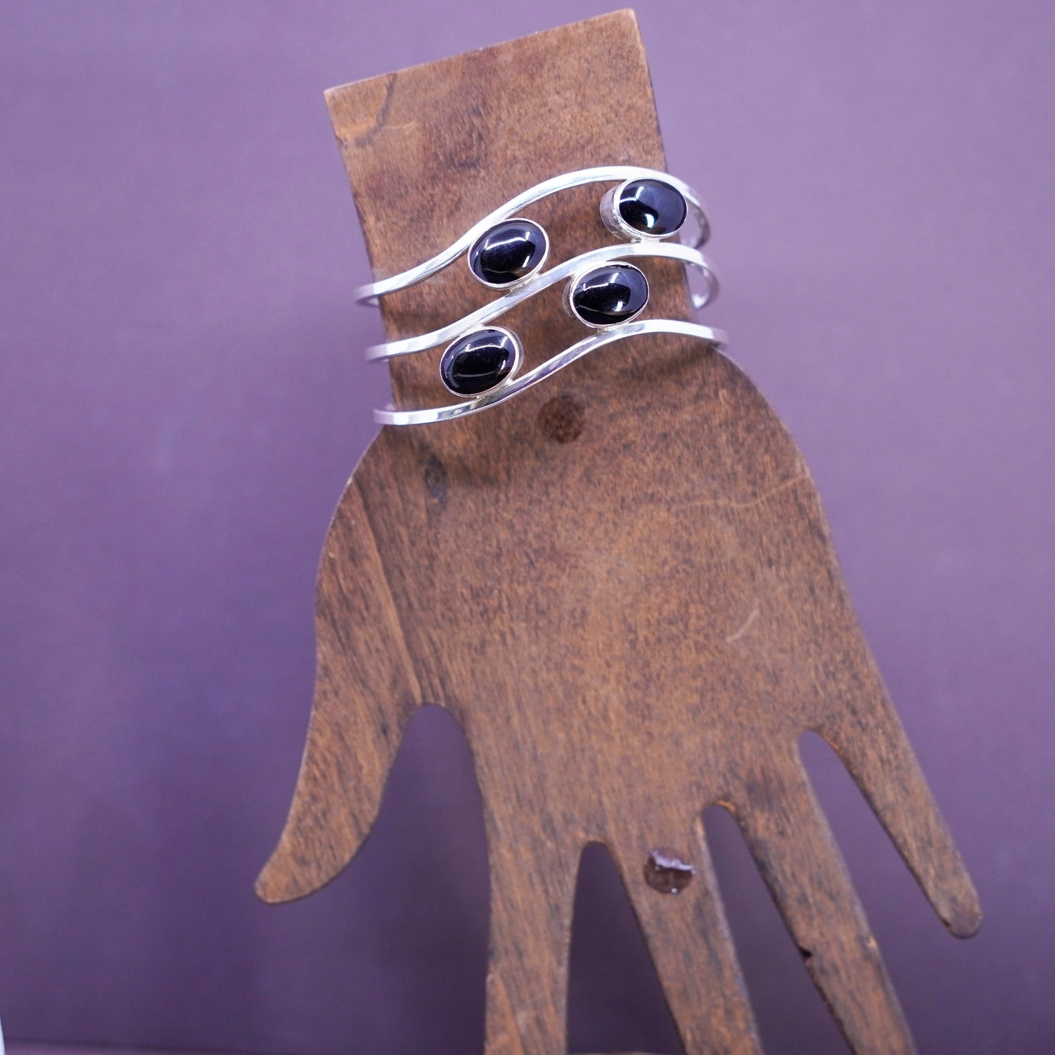 6.5", antique sterling silver handmade bracelet, wide 925 cable cuff with onyx, stamped 925 Mexico TA-70