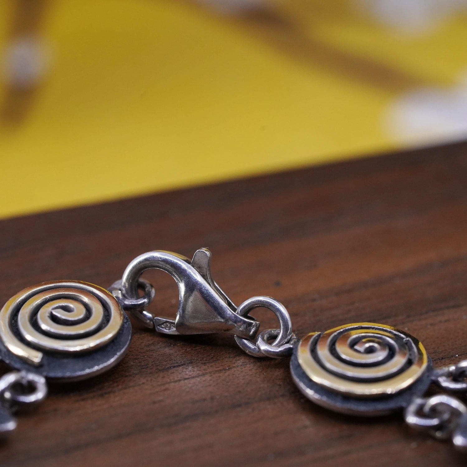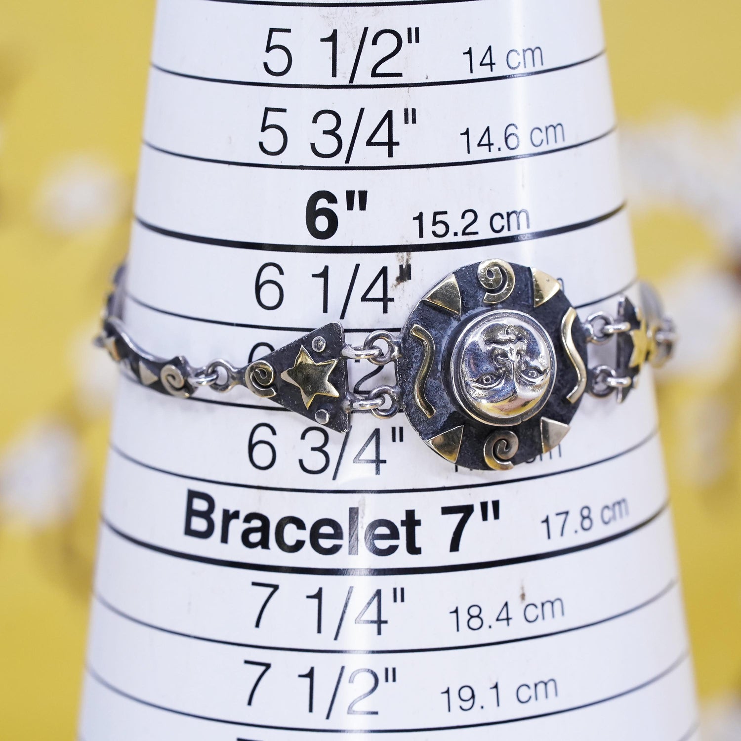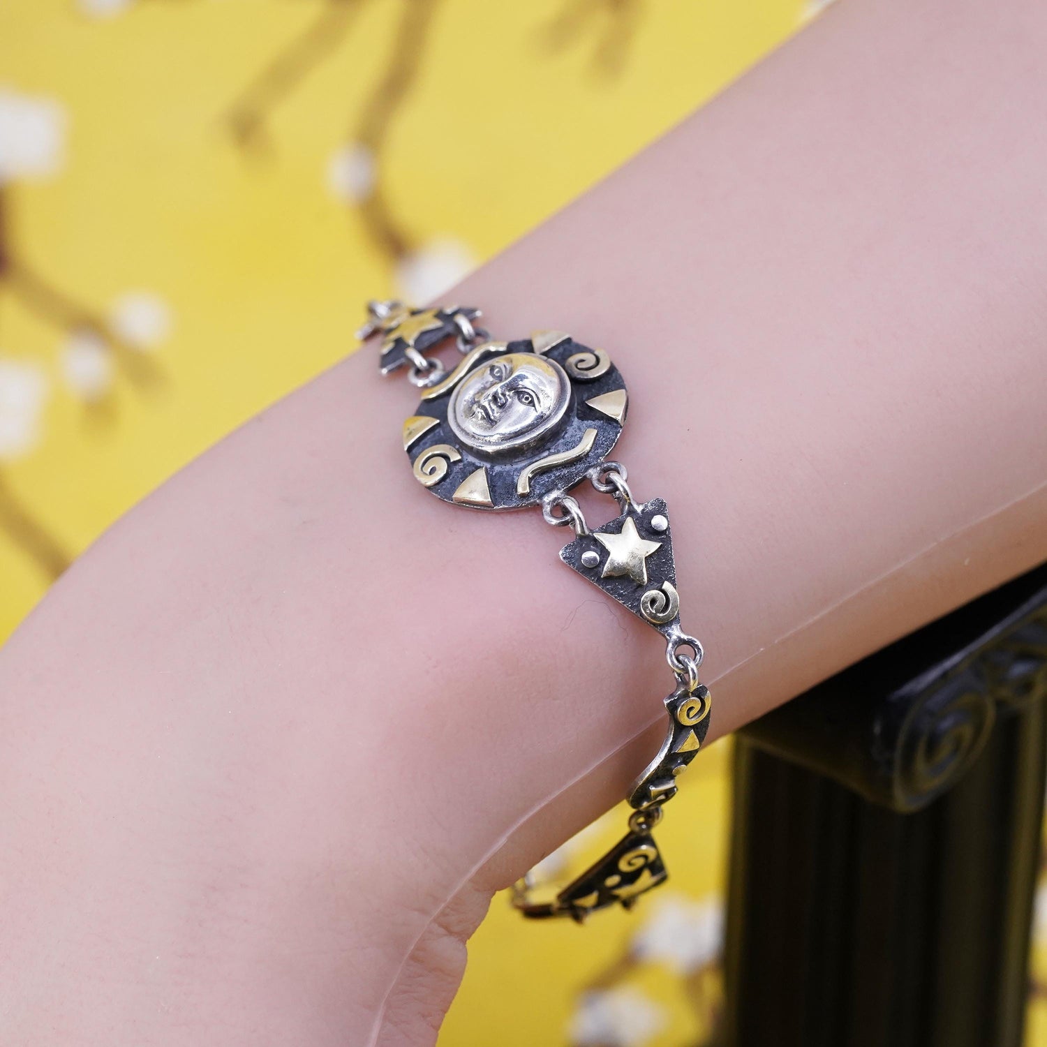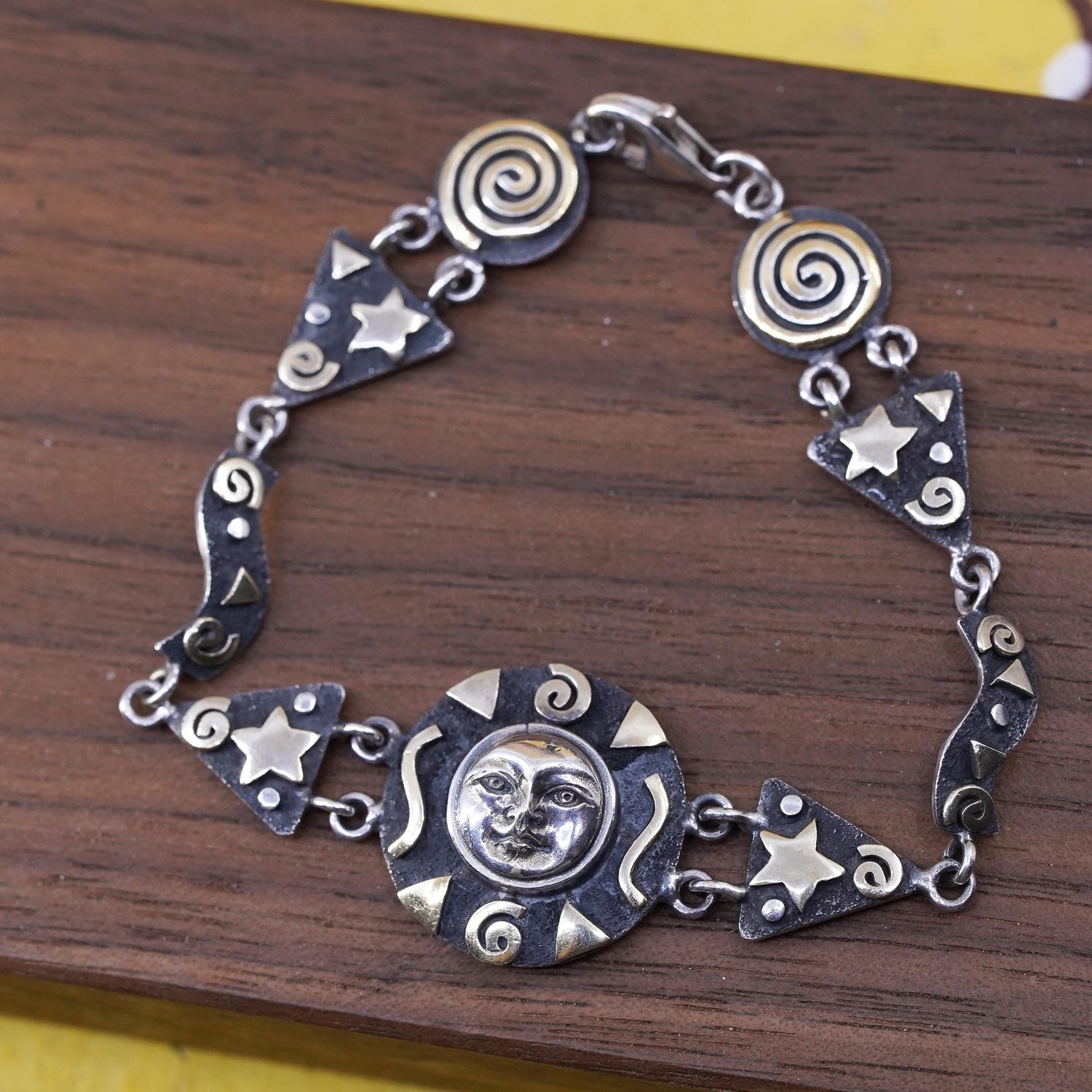6.5", vintage two tone Sterling silver handmade bracelet, 925 sun face charm