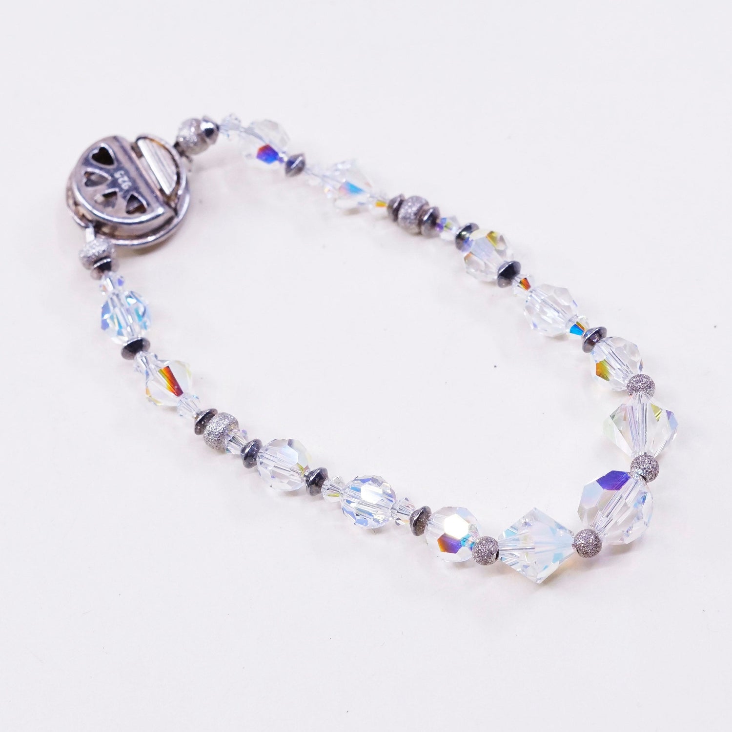 6.5", vintage sterling silver handmade bracelet, 925 clasp with crystal beads, stamped 925