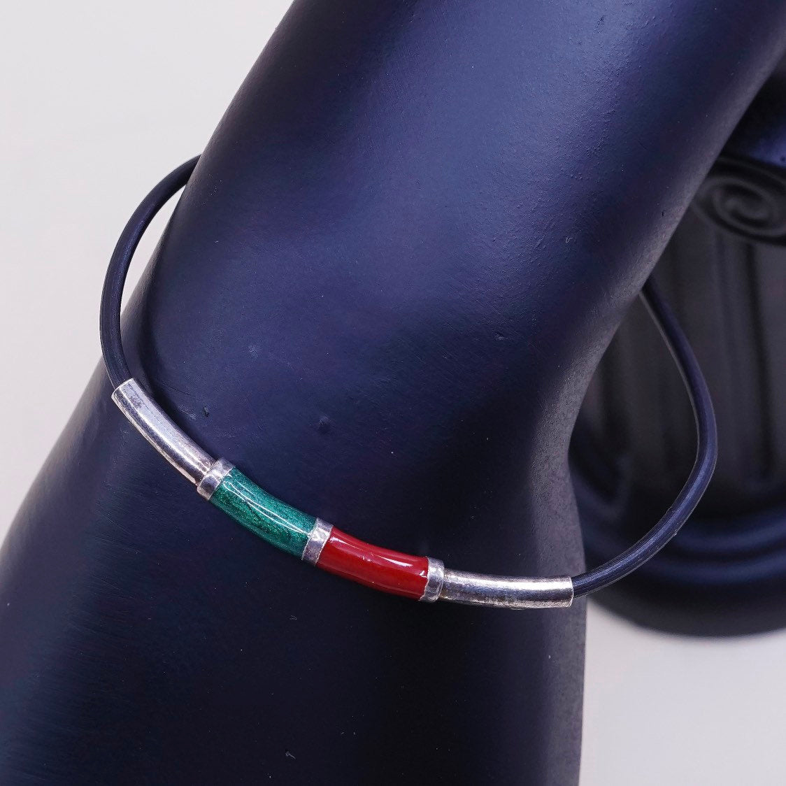 6.5”, VTG Sterling silver handmade bracelet, 925 enamel bar w/ rubber