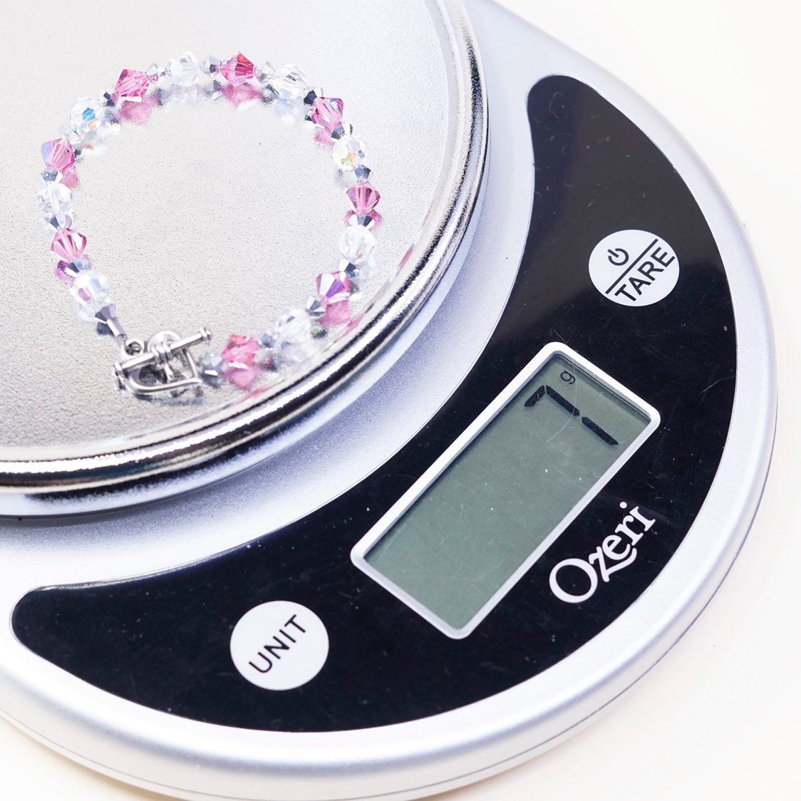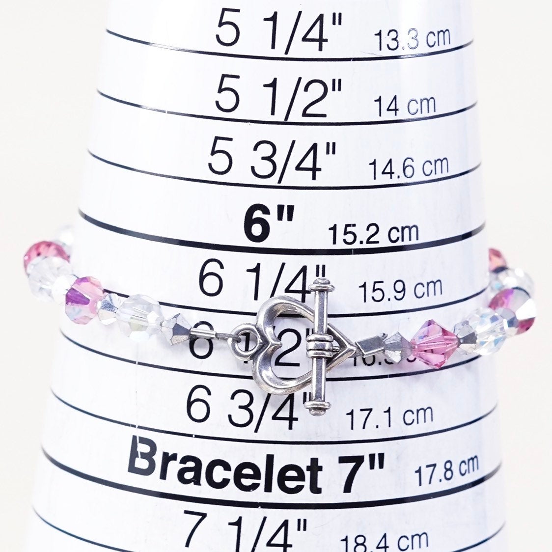 6.5”, VTG Sterling silver handmade bracelet, 925 heart toggle w/ pink crystal