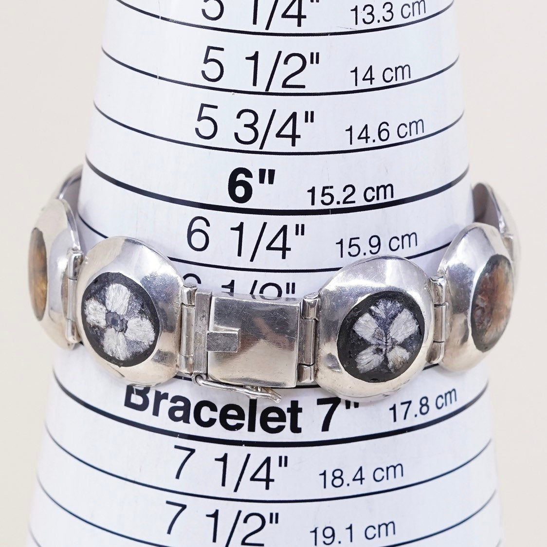 6.5", vintage Sterling silver handmade bracelet, solid 925 silver link with mother of pearl clover inlay, stamped 925