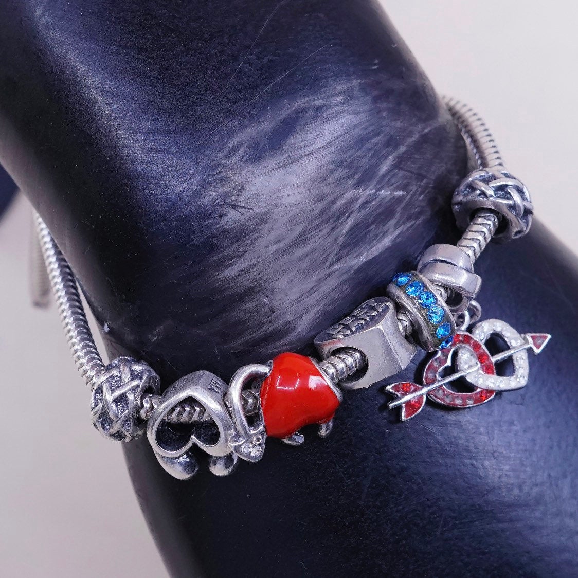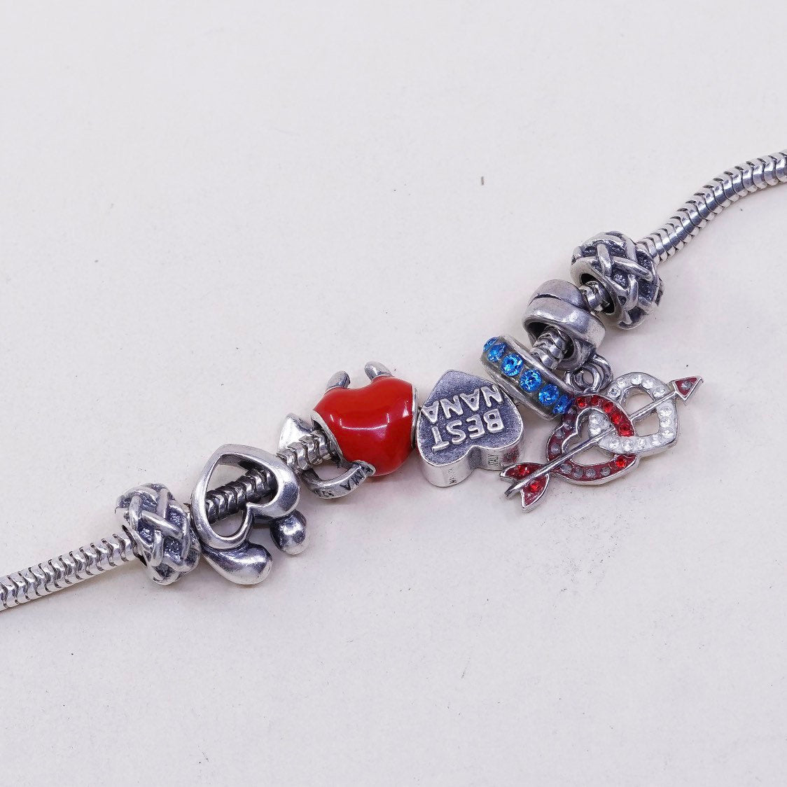 6.75" 3mm, Vintage Sterling silver bracelet, 925 silver bold snake chain, with 7 charms includes double heat, heart with "best nana", evil heart with tail. Stamped 925 Italy
