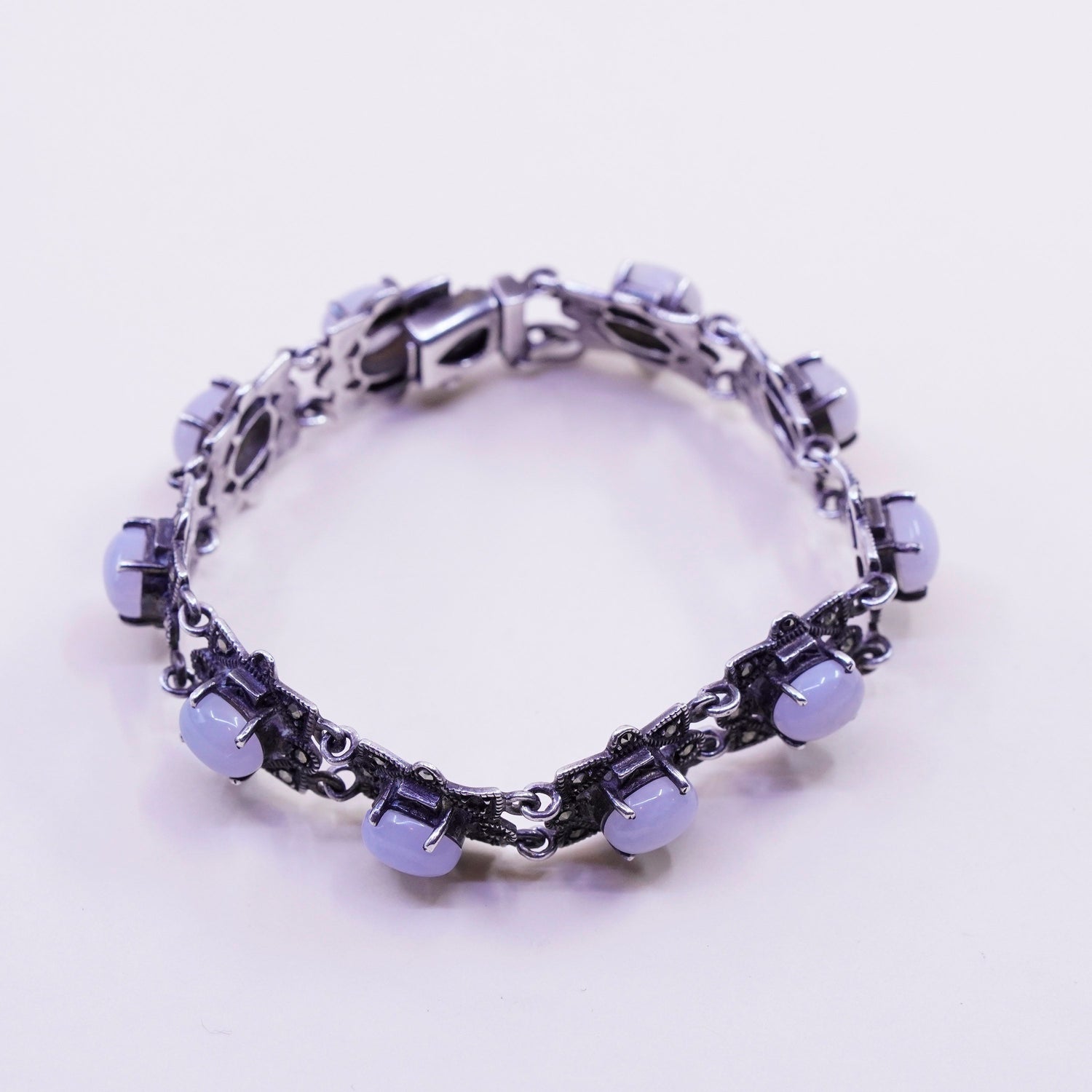 6.75", vintage Sterling 925 Silver Handmade tennis Bracelet with Marcasite and lace agate, stamped 925