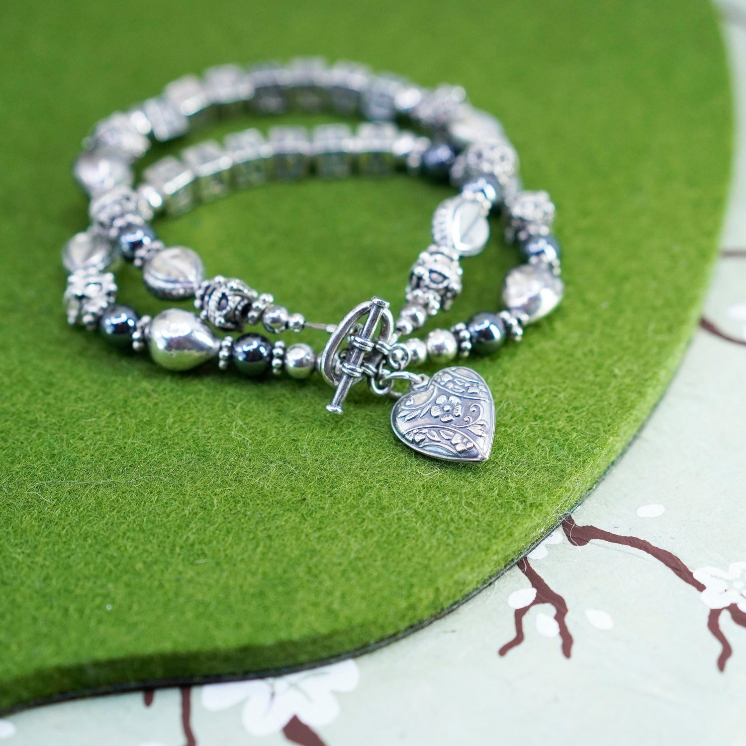 6.75", vintage handmade Sterling 925 Silver hematite beads bracelet with names "Raymond Sandra" cubes and heart charm, stamped sterling