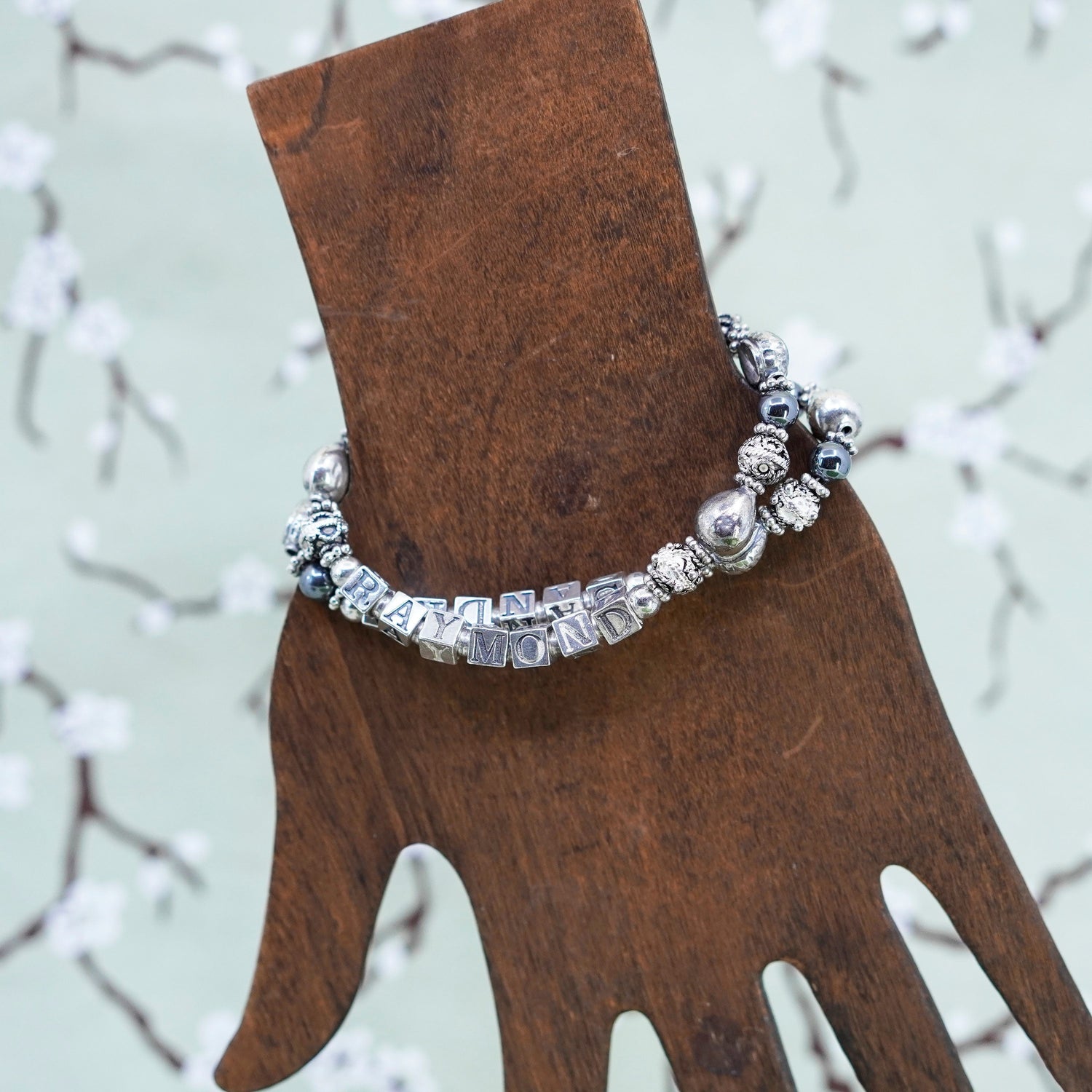 6.75”, Sterling 925 Silver hematite beads bracelet names “Raymond Sandra” cubes