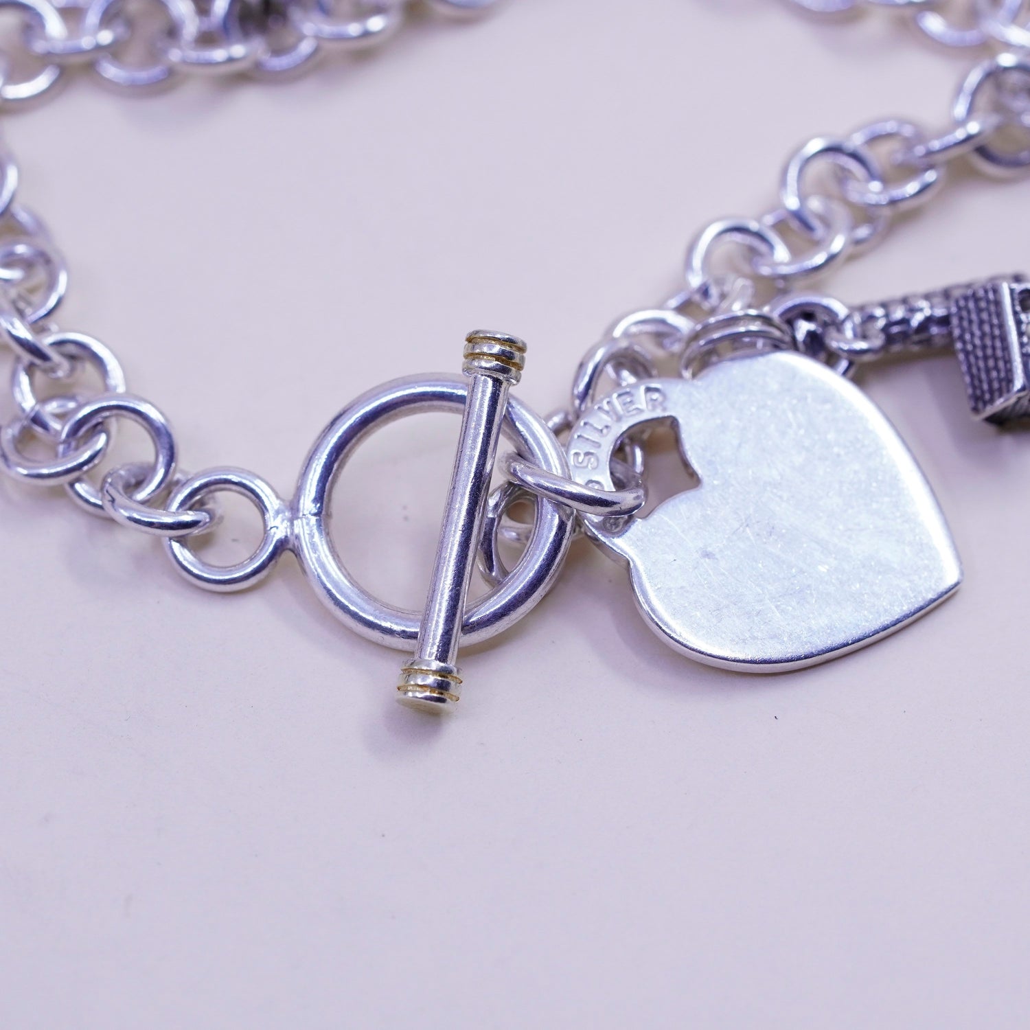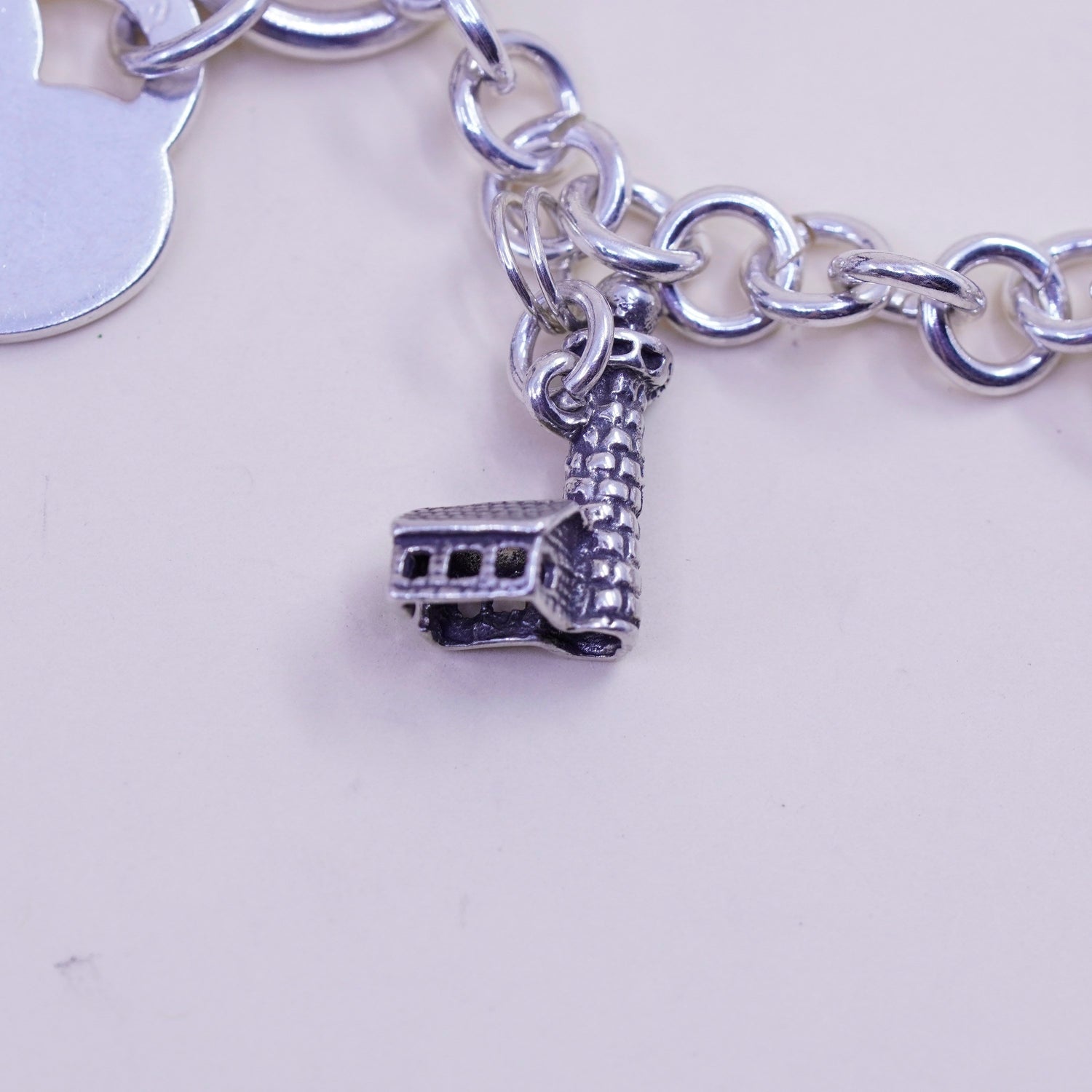 6.75" 7mm, Vintage sterling silver circle link bracelet, bold circle link chain with heart bible cross piano pineapple lighthouse charm, stamped 925 silver