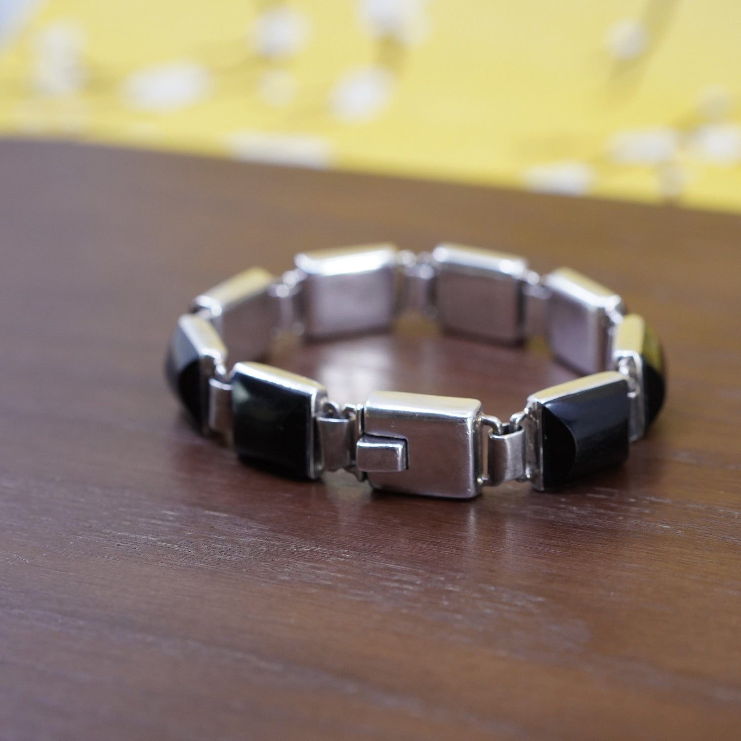 6.75", vintage Sterling silver handmade bracelet, Mexico 925 chain with square onyx, stamped Mexico 925 TV-27