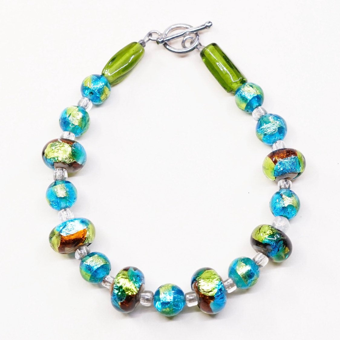 6.75", vintage 925 Sterling silver beads bracelet with artisan green glass beads with toggle closure, stamped 925