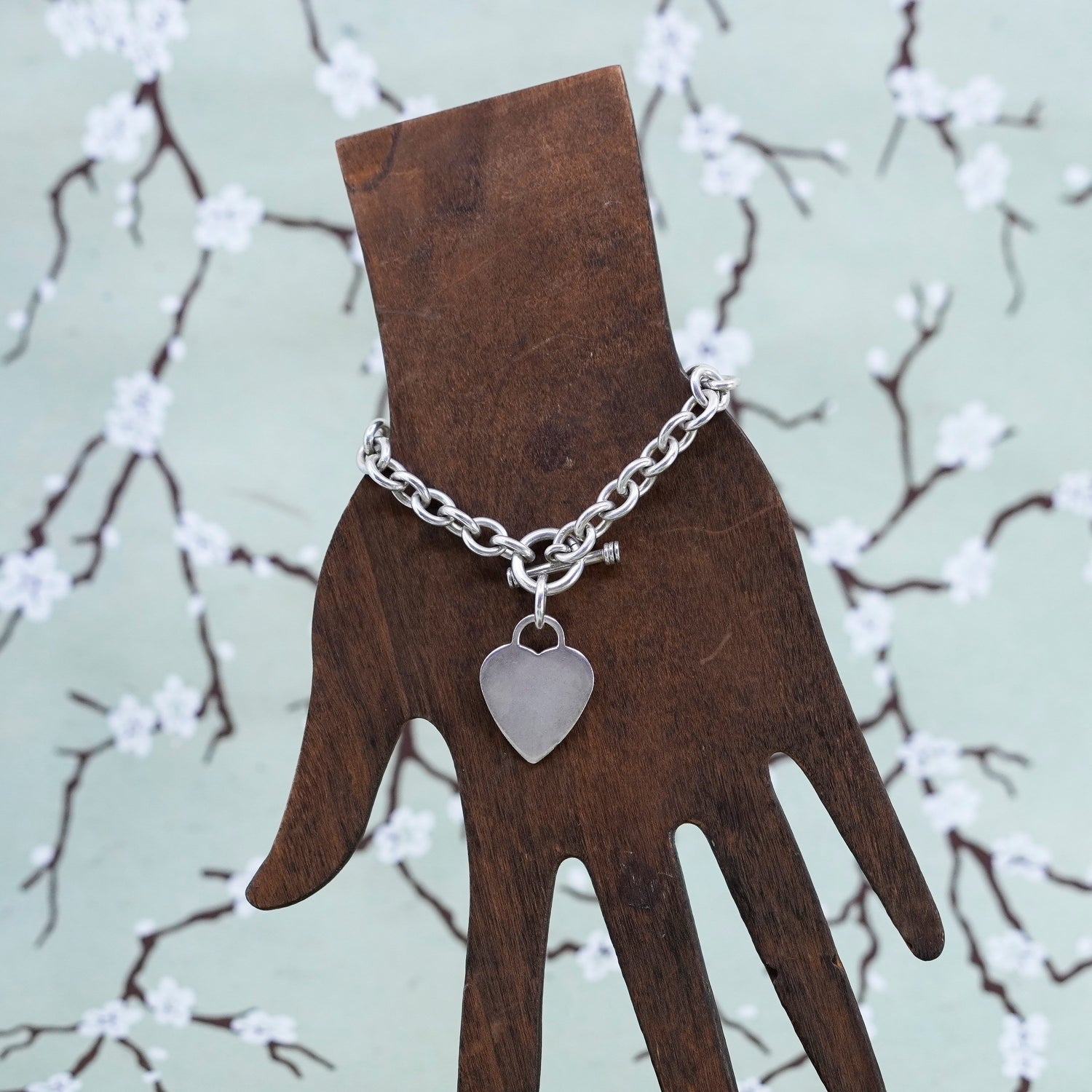 6", 9mm, Vintage sterling silver circle link bracelet, bold 925 chain with heart charm and toggle closure, Stamped 925 Italy