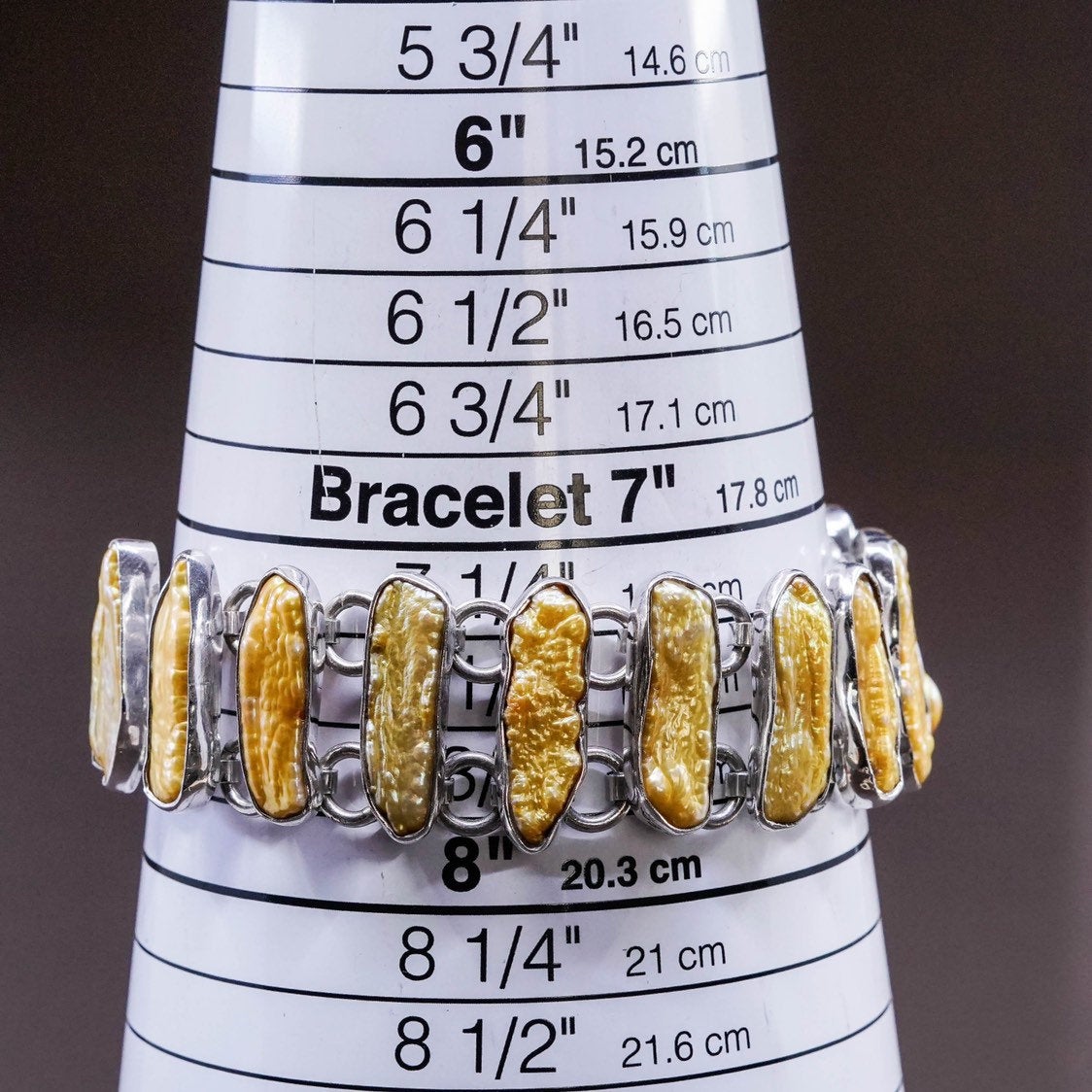 7”+1.5”, vtg handmade Sterling 925 Silver gold Pearl bracelet w/ toggle closure