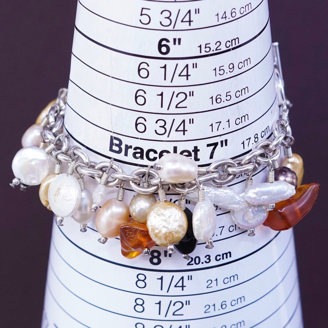 7.25", Vintage Sterling silver handmade bracelet, 925 circle link chain with pearl and amber obsidian beads bracelet, silver tested