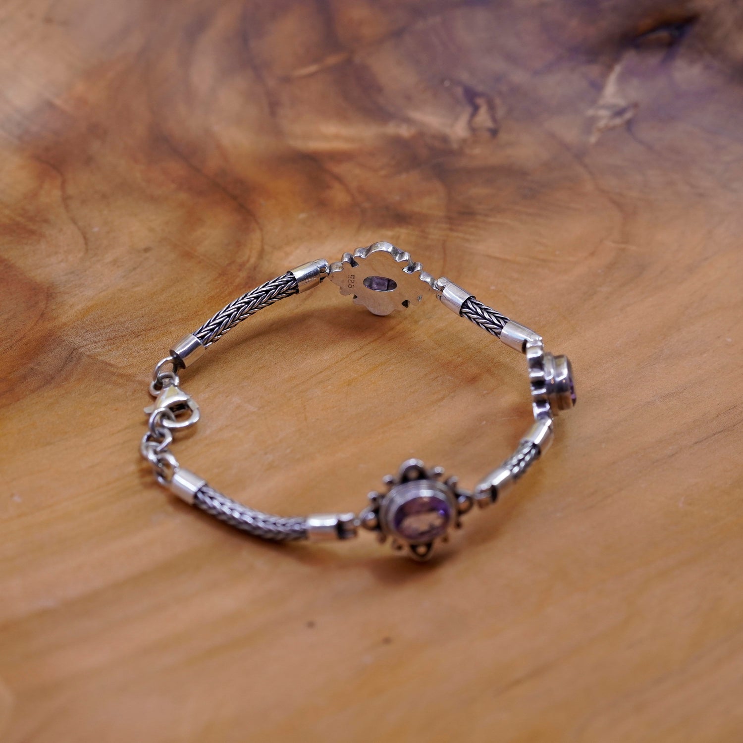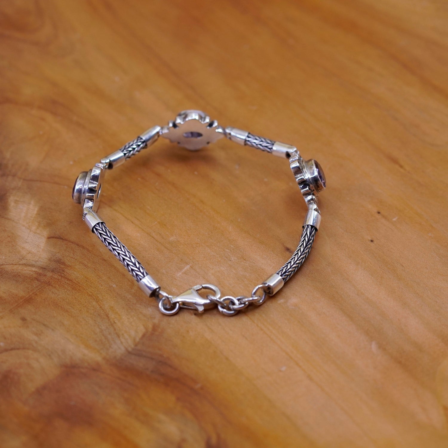 7.25”, Sterling silver handmade bracelet, bold 925 wheat chain amethyst