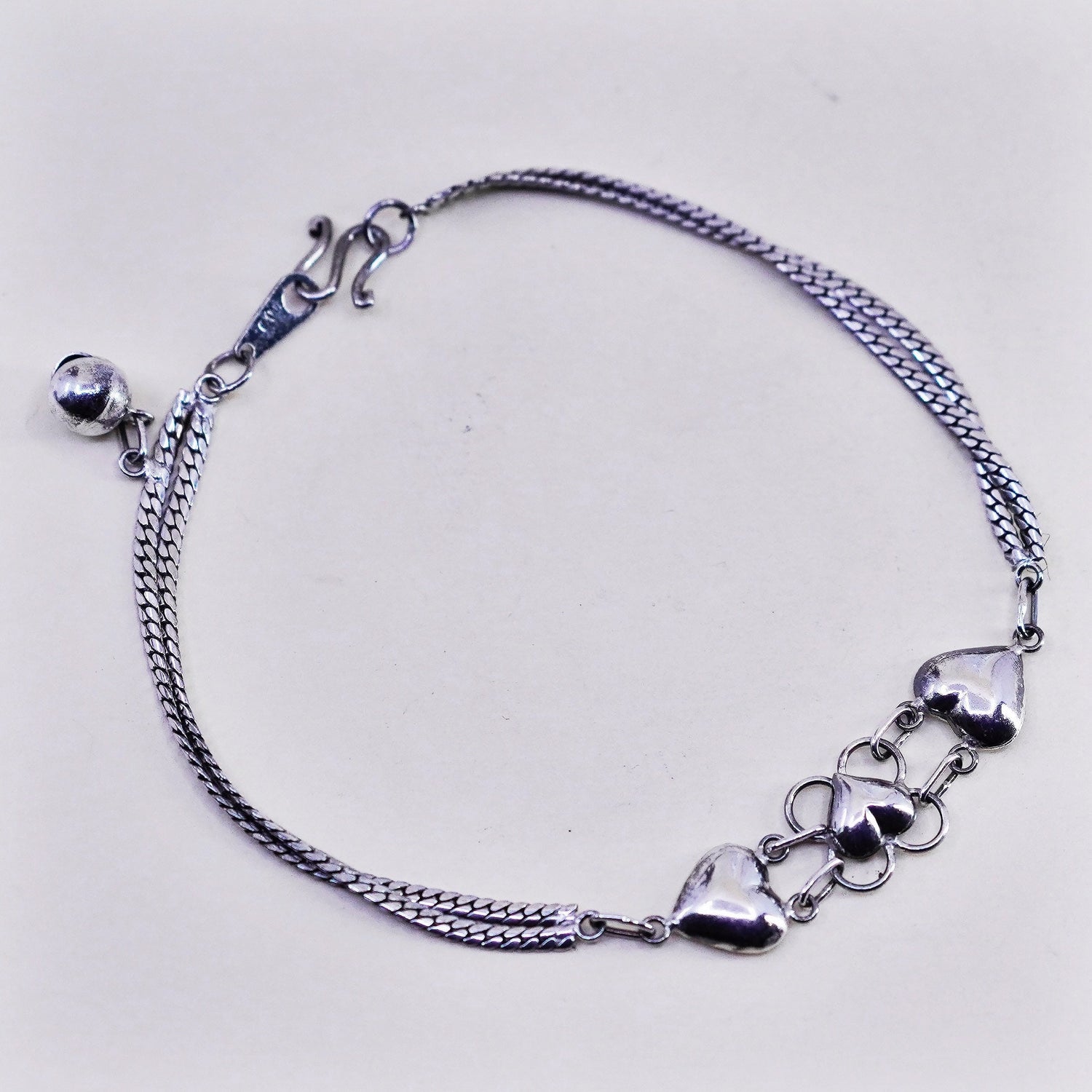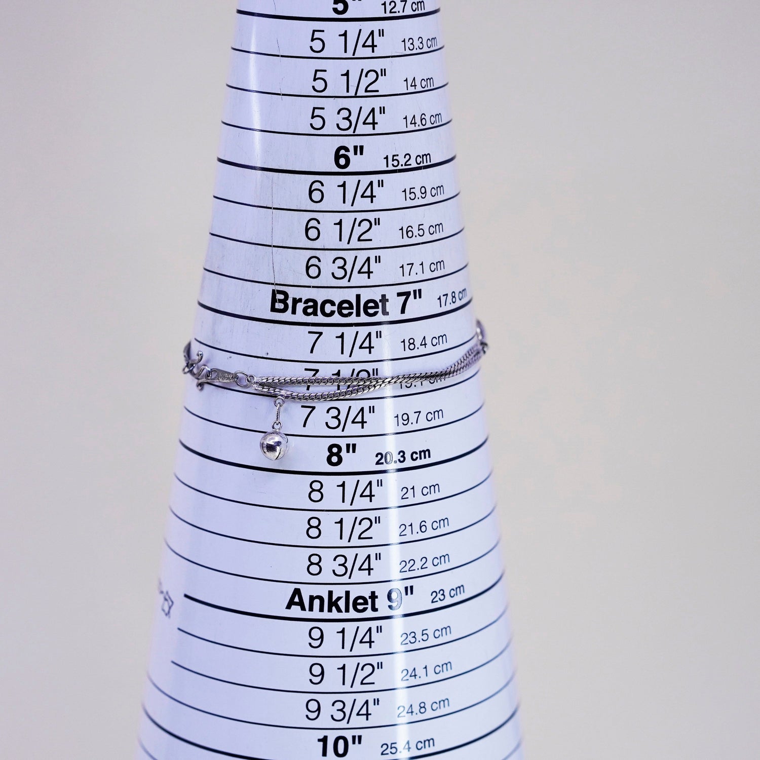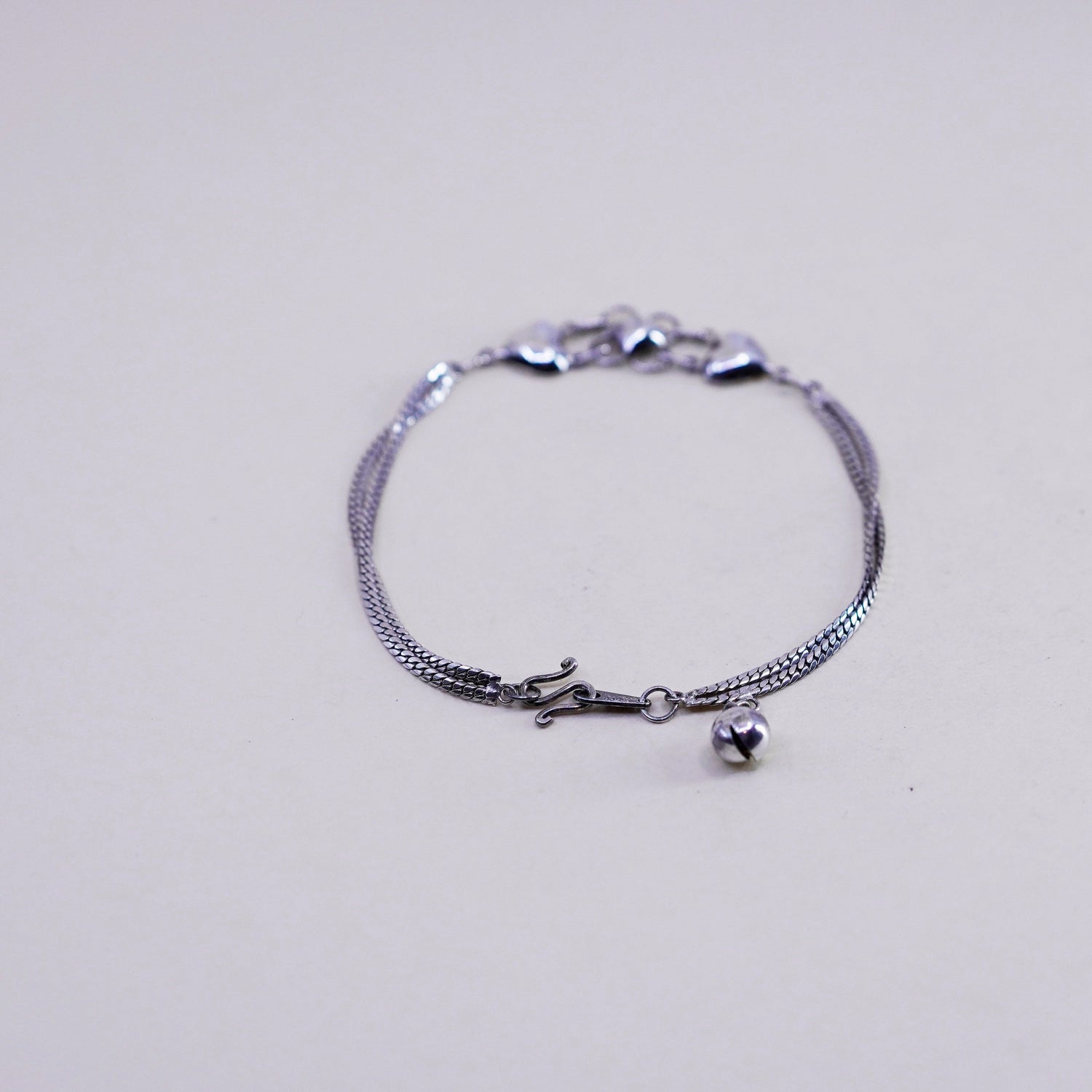 7.5", vintage Sterling Silver Handmade Bracelet, 925 curb chain with heart and bell chime, stamped 925